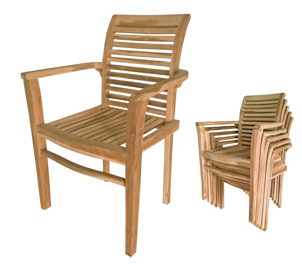 Die sechs Stapelstühle JAVA sind ebenfalls aus Teakholz gefertigt und bieten nicht nur Komfort, sondern auch eine elegante Note mit ihren Armlehnen. Diese Stühle können gestapelt werden, was die Aufbewahrung und Platzersparnis erleichtert.