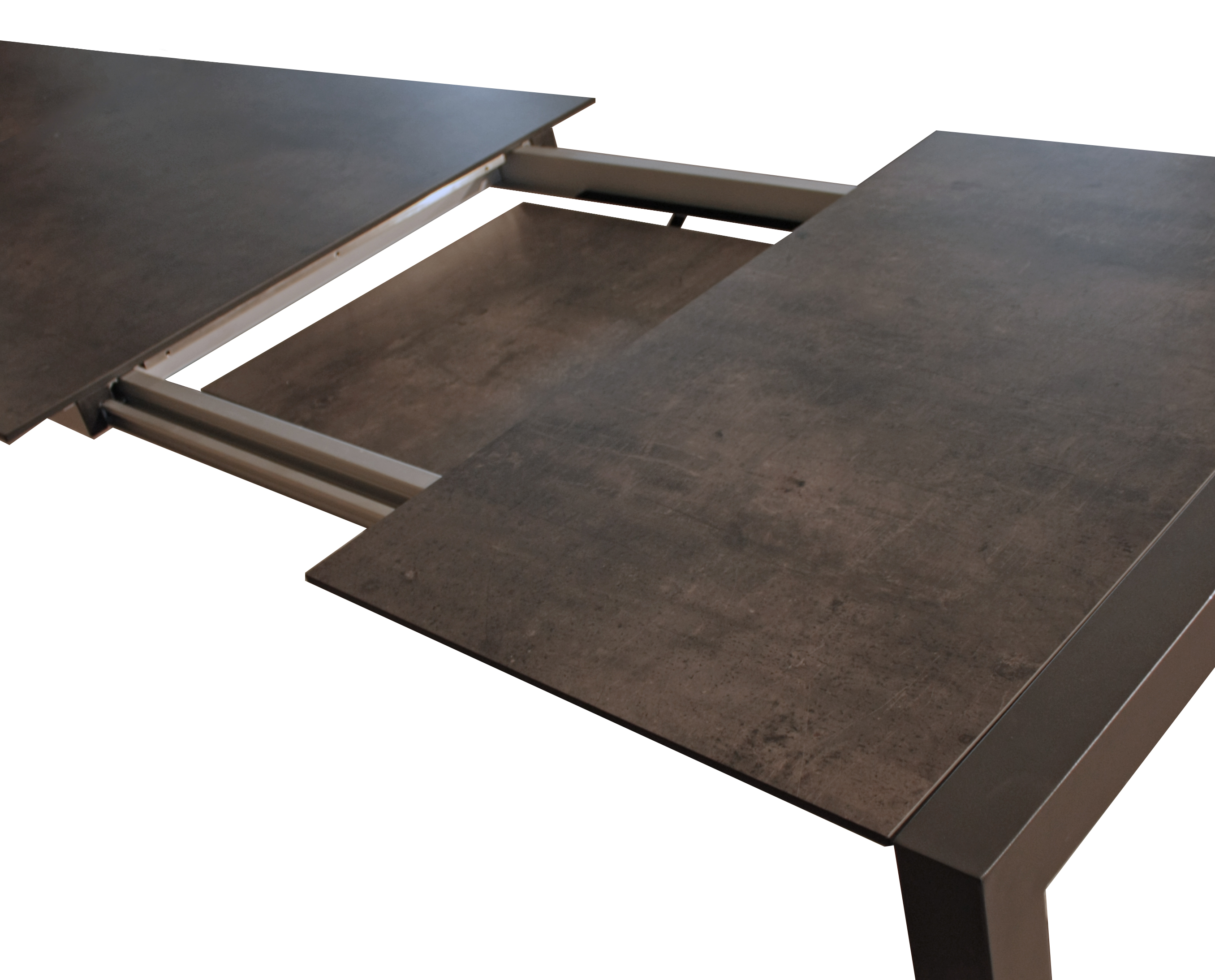 Der Ausziehtisch SOPHIA besteht aus strapazierfähigem pfefferschwarzem (Industrial) Aluminium, das pulverbeschichtet ist, und verfügt über eine dunkelbraune Kunststoff HPL-Tischplatte in Grau, die langlebig und pflegeleicht ist.