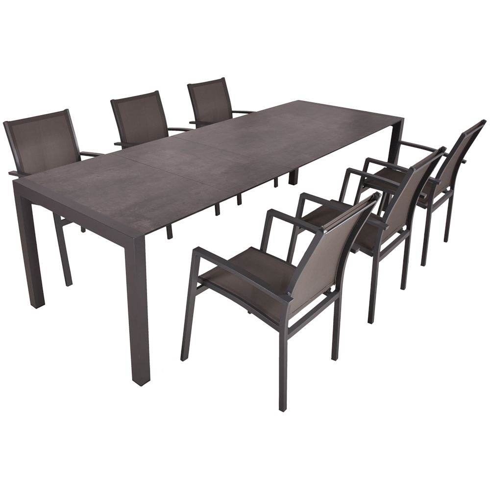 Dieses Set enthält einen Ausziehtisch und sechs Stapelstühle, die perfekt aufeinander abgestimmt sind und eine stilvolle und bequeme Sitzlösung für gesellige Mahlzeiten im Freien bieten.