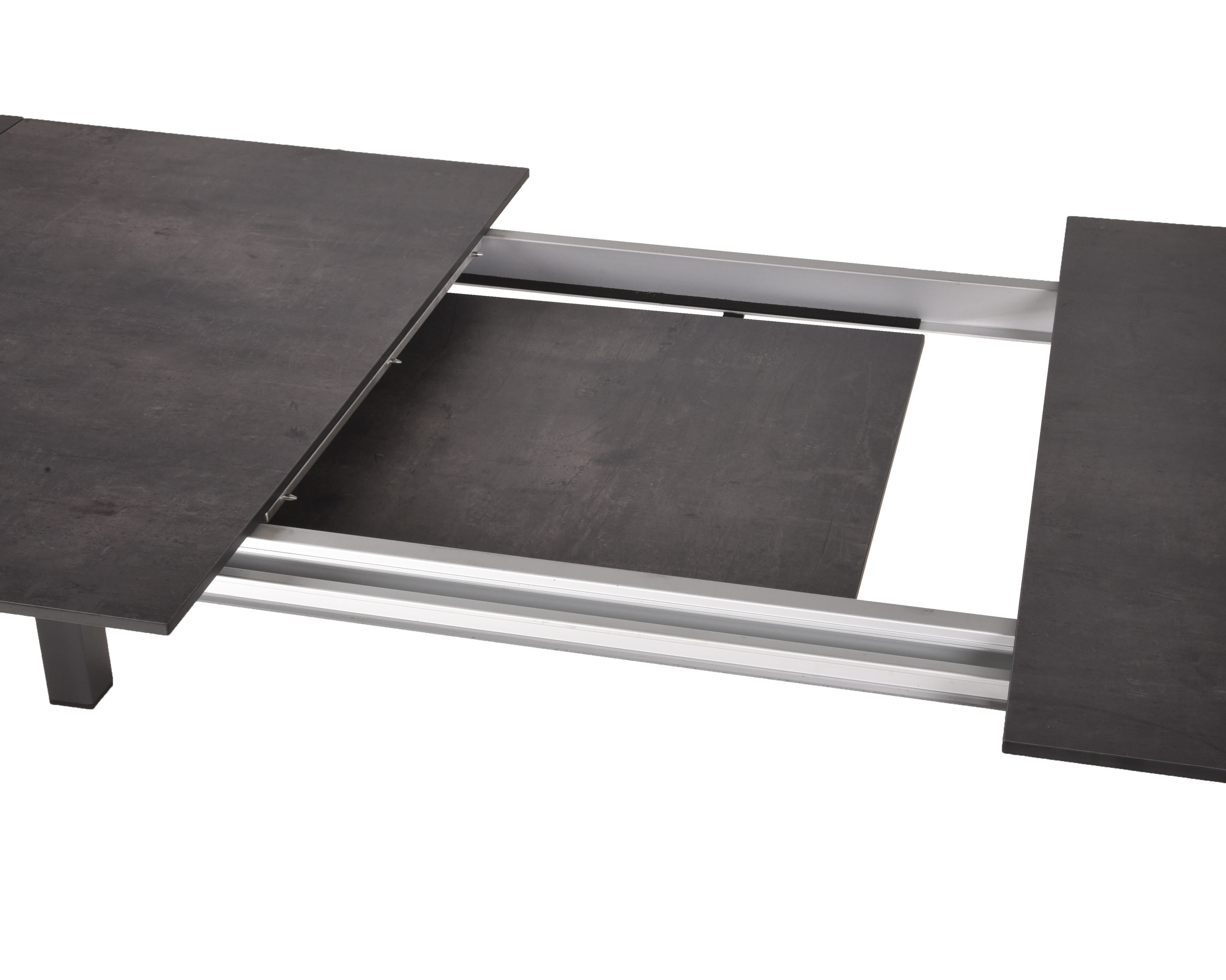 Der Ausziehtisch SOPHIA besteht aus strapazierfähigem pfefferschwarzem (Industrial) Aluminium, das pulverbeschichtet ist, und verfügt über eine dunkelbraune Kunststoff HPL-Tischplatte, die langlebig und pflegeleicht ist.