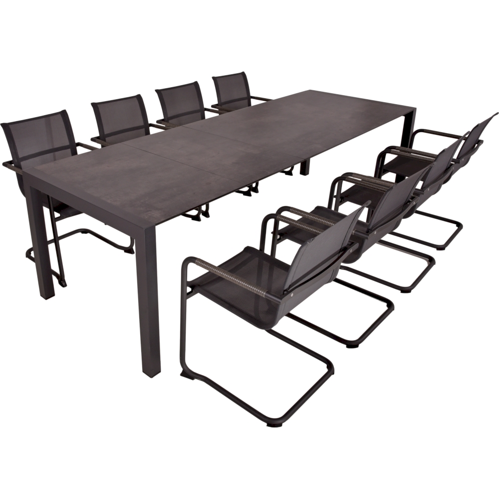 Dieses Set enthält einen Ausziehtisch und acht Freischwinger-Stühle, die perfekt aufeinander abgestimmt sind und eine moderne und komfortable Sitzlösung für Ihre Outdoor-Mahlzeiten bieten.