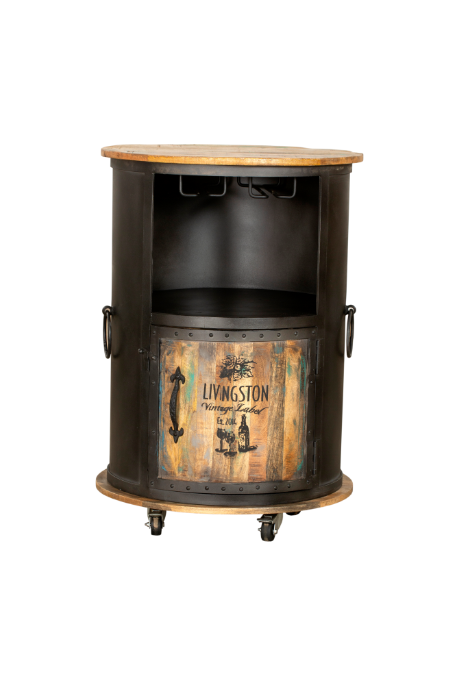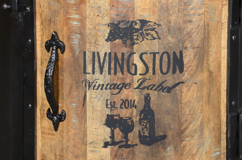 Der Artikel ist aus schwarzem Stahl (pulverbeschichtet) hergestellt und die Türen (mit Aufdruck: LIVINGSTON – Vintage Label) sowie die Top & Bodenplatte sind aus massivem recyceltem Mangoholz.