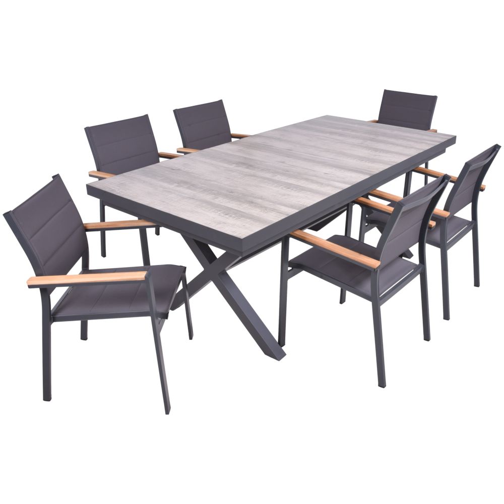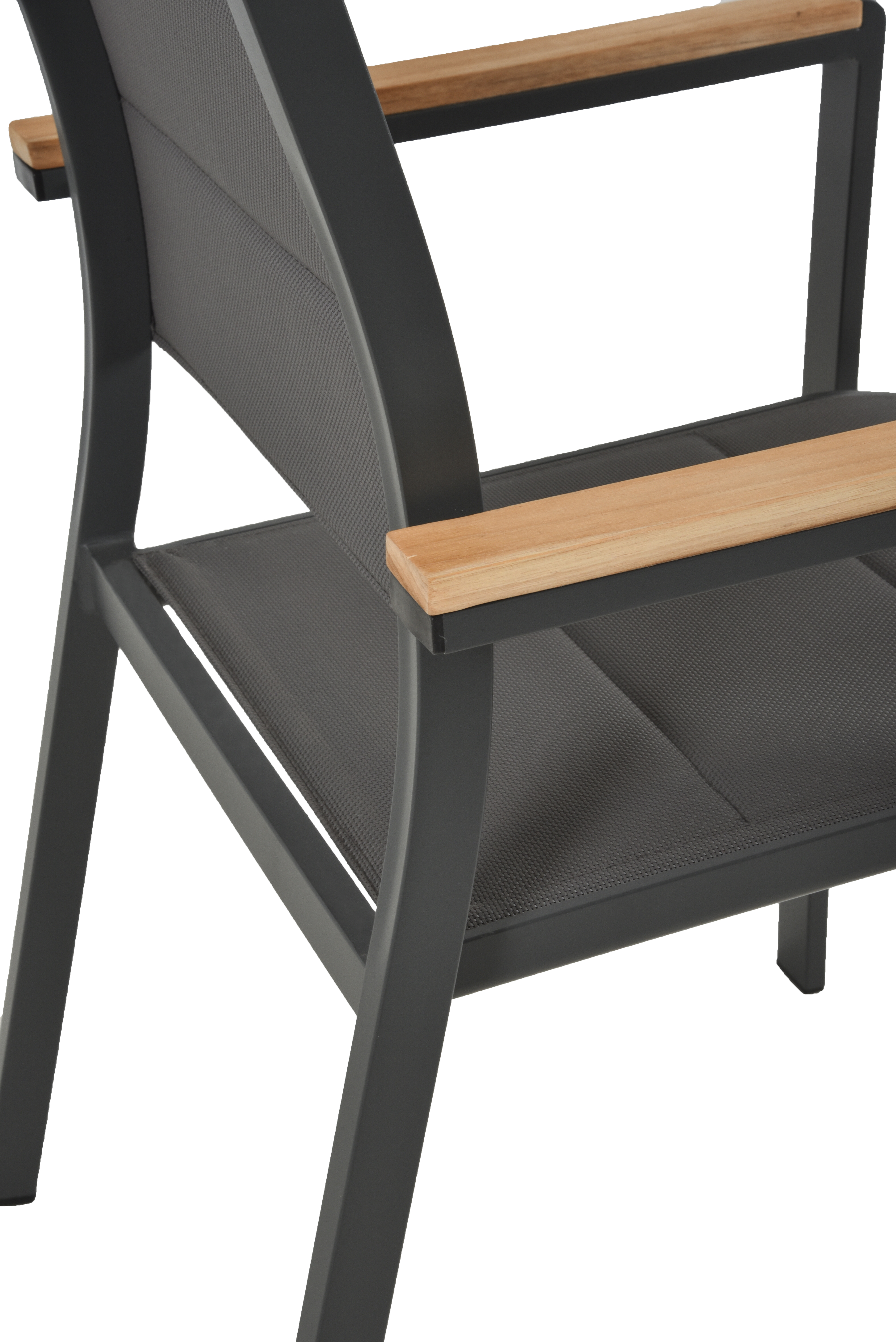 Die Stapelstühle DAVINA sind aus anthrazitfarbenem Aluminium gefertigt und verfügen über Sitzflächen und Rückenlehnen aus dunkelgrauem Kunststoffgewebe. Die Armlehnen sind aus Teakholz mit FSC-Zertifizierung und verleihen den Stühlen einen Hauch von Natürlichkeit und Komfort. Mit einem Tisch und sechs Stühlen ist dieses Set perfekt für gemütliche Mahlzeiten im Freien oder gesellige Zusammenkünfte mit Freunden und Familie.