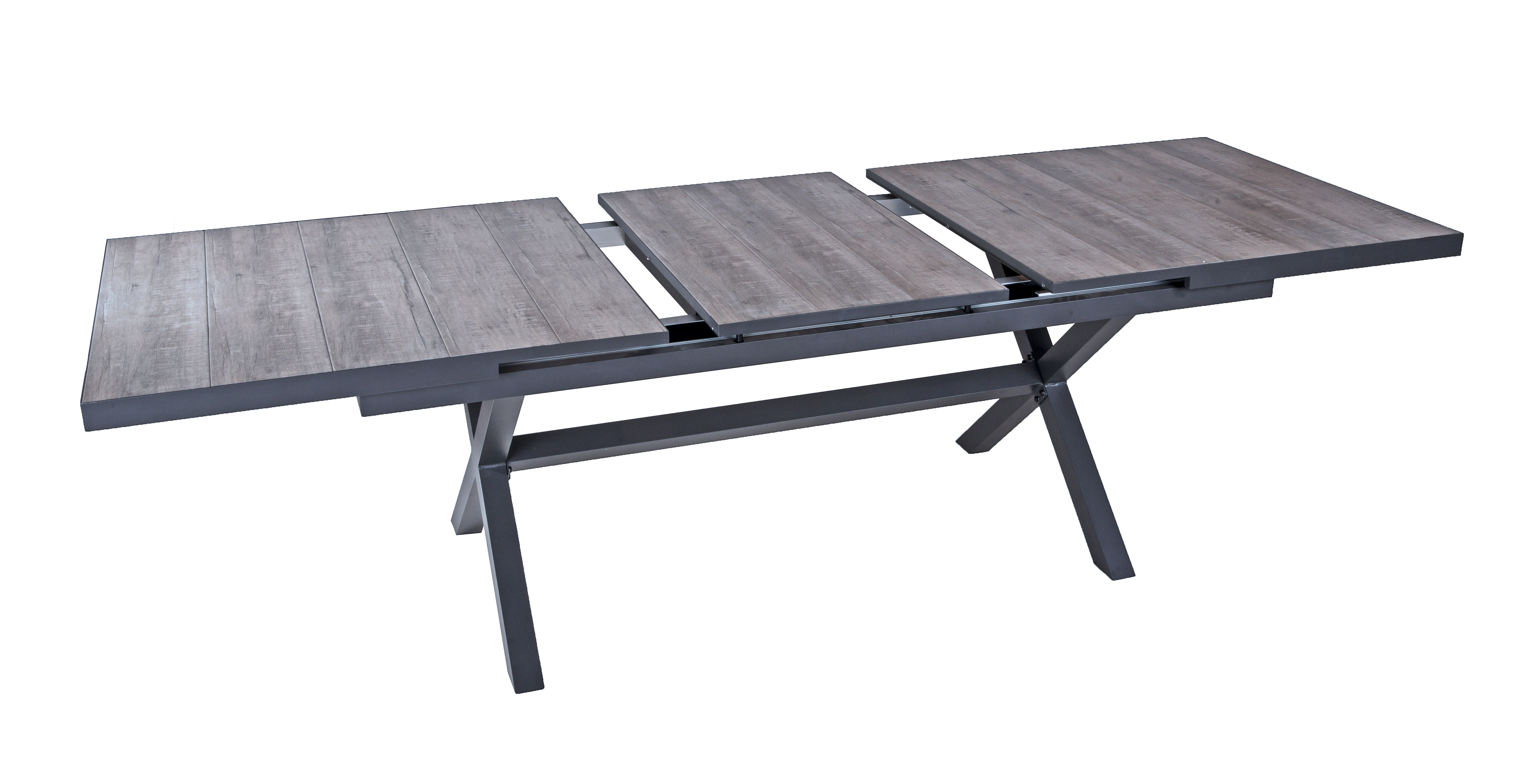 Die Tischgruppe RANA/TREVISO bietet eine großartige Lösung für Ihre Outdoor-Essbedürfnisse. Der Ausziehtisch RANA ist aus robustem, dunkelgrauem Aluminium gefertigt und verfügt über eine langlebige Tischplatte aus Keramik in Eiche-Optik. Diese Kombination aus Materialien verleiht dem Tisch nicht nur ein modernes Aussehen, sondern sorgt auch für Wetterbeständigkeit und Haltbarkeit.