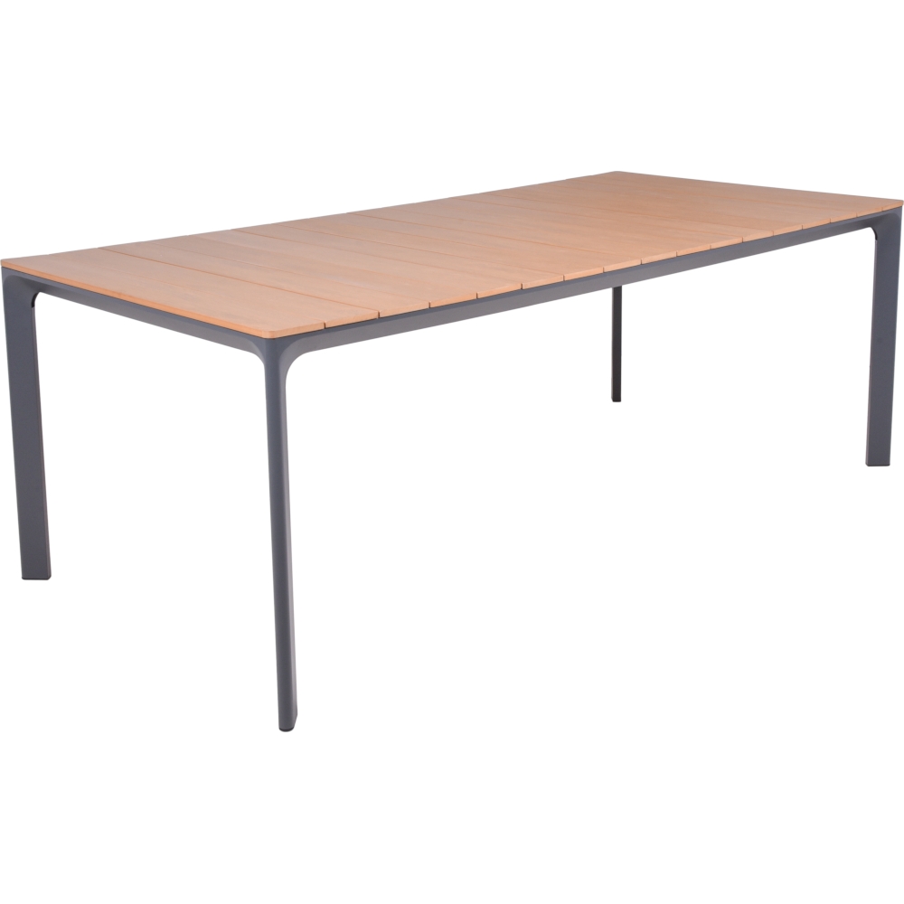 Der Tisch SILEA kombiniert Aluminium mit Non-Wood und bietet eine moderne Optik in Holzoptik. Das pulverbeschichtete Aluminiumgestell in Anthrazit sorgt für Stabilität und einen eleganten Look, der sich in verschiedene Außenbereiche einfügt. Perfekt geeignet für den Garten oder die Terrasse, bietet dieser Tisch eine stilvolle und praktische Lösung für Ihre Outdoor-Bereiche.