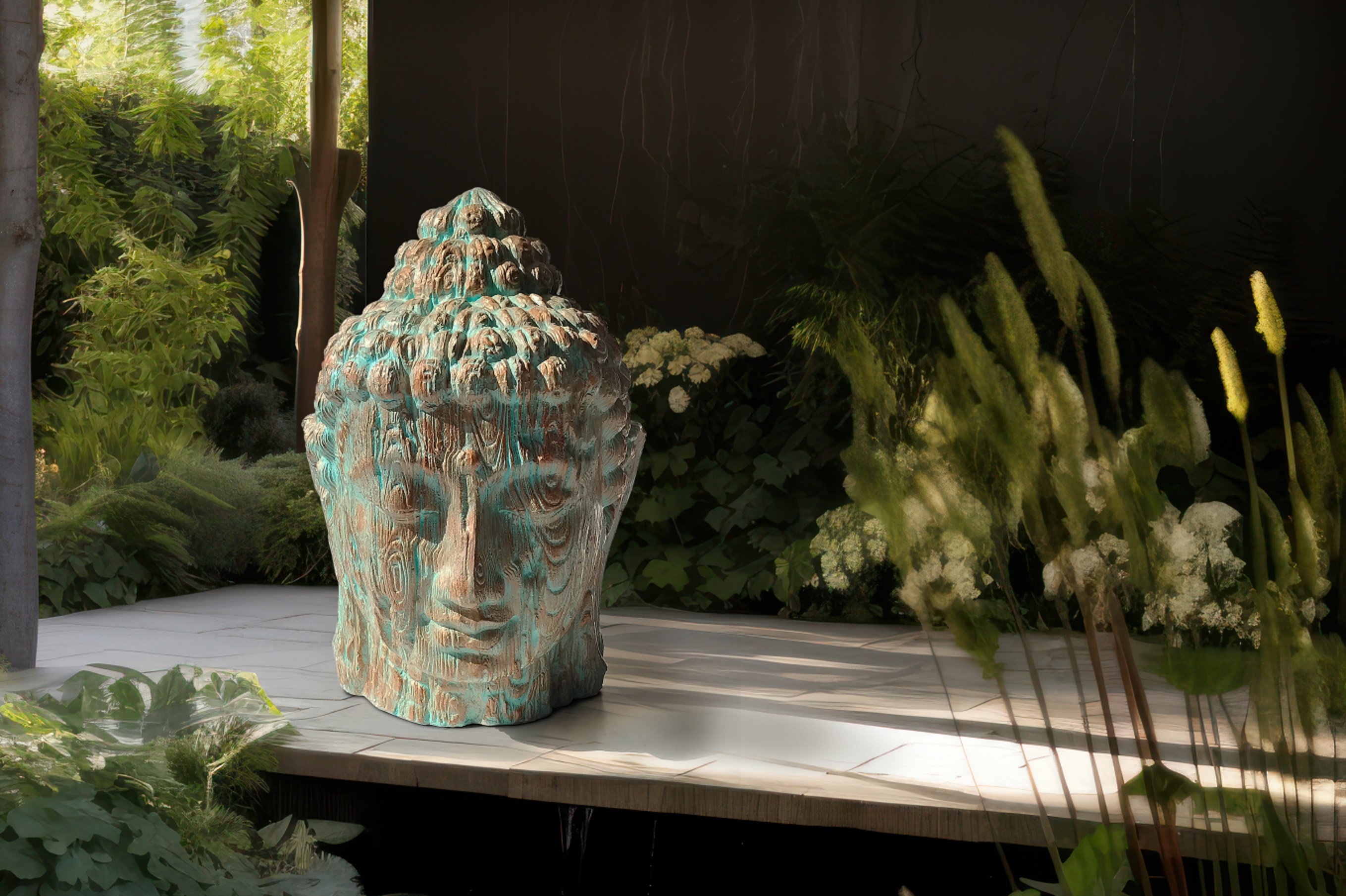 Der Buddhakopf aus Fiberglas und Beton überzeugt durch sein kunstvolles Design und eine ansprechende Farbgestaltung in Gold und Grün. Mit seiner hochwertigen Verarbeitung eignet er sich ideal als stilvolle Dekoration für Innen- und Außenbereiche. Dieses dekorative Highlight bringt eine harmonische und meditative Atmosphäre in Ihr Zuhause.