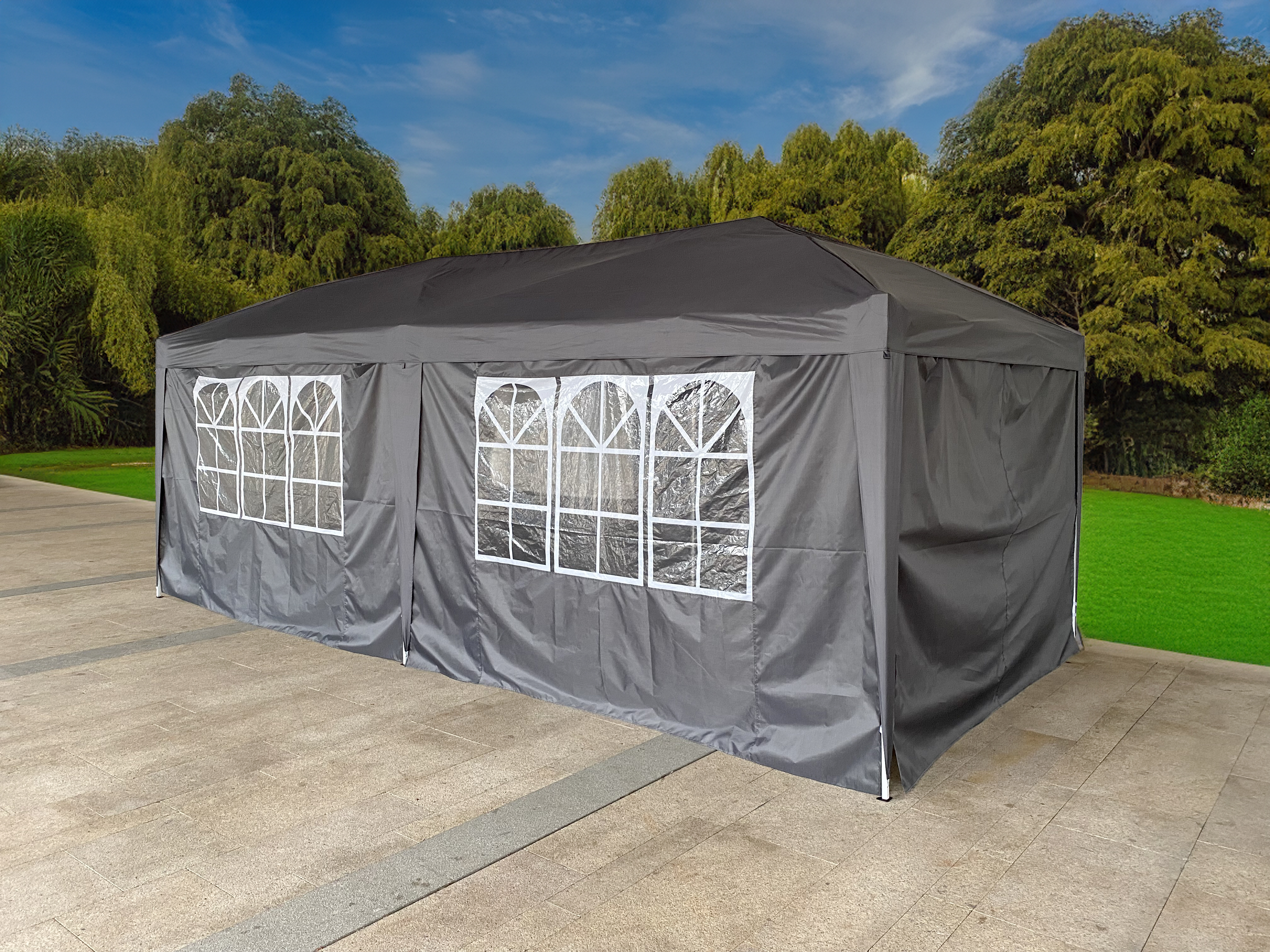 Der Pavillon SAMBESI in Anthrazit besteht aus robustem Stahl und ist mit einem Polyesterdach ausgestattet. Das faltbare Design ermöglicht eine einfache Aufbewahrung und einen schnellen Aufbau. Er bietet einen hervorragenden Schutz vor Sonne und Regen und eignet sich perfekt für verschiedene Outdoor-Aktivitäten und Gartenfeste.