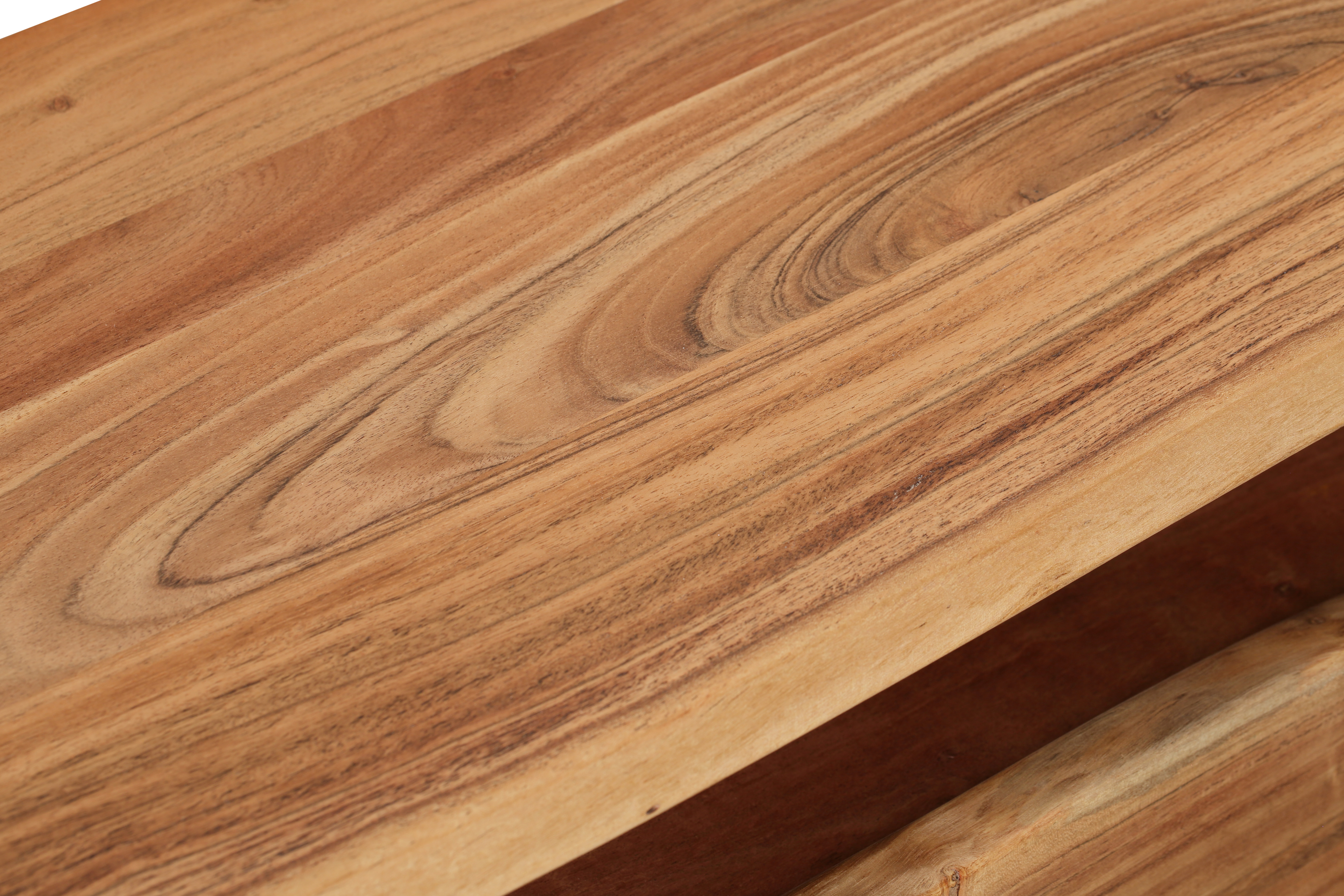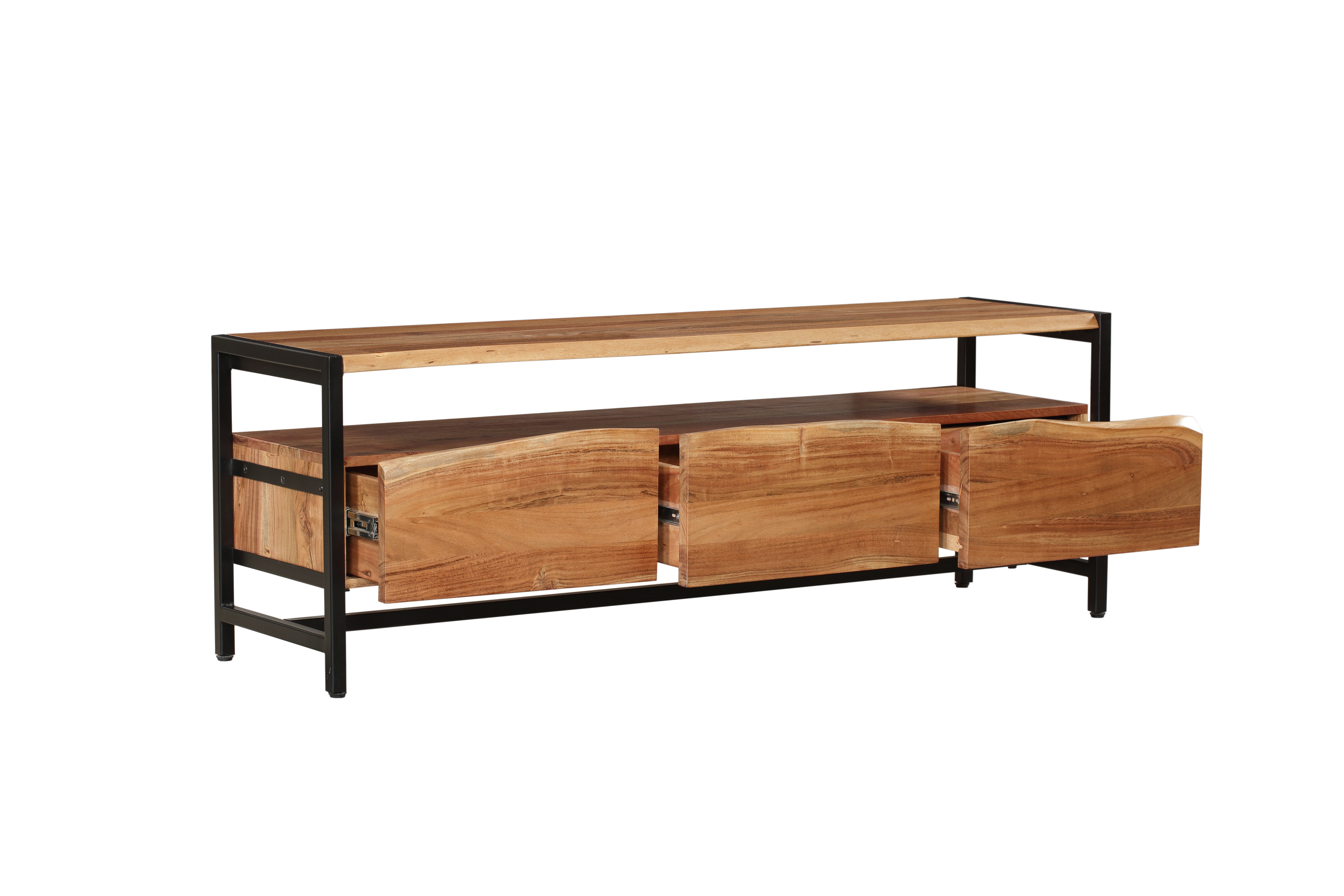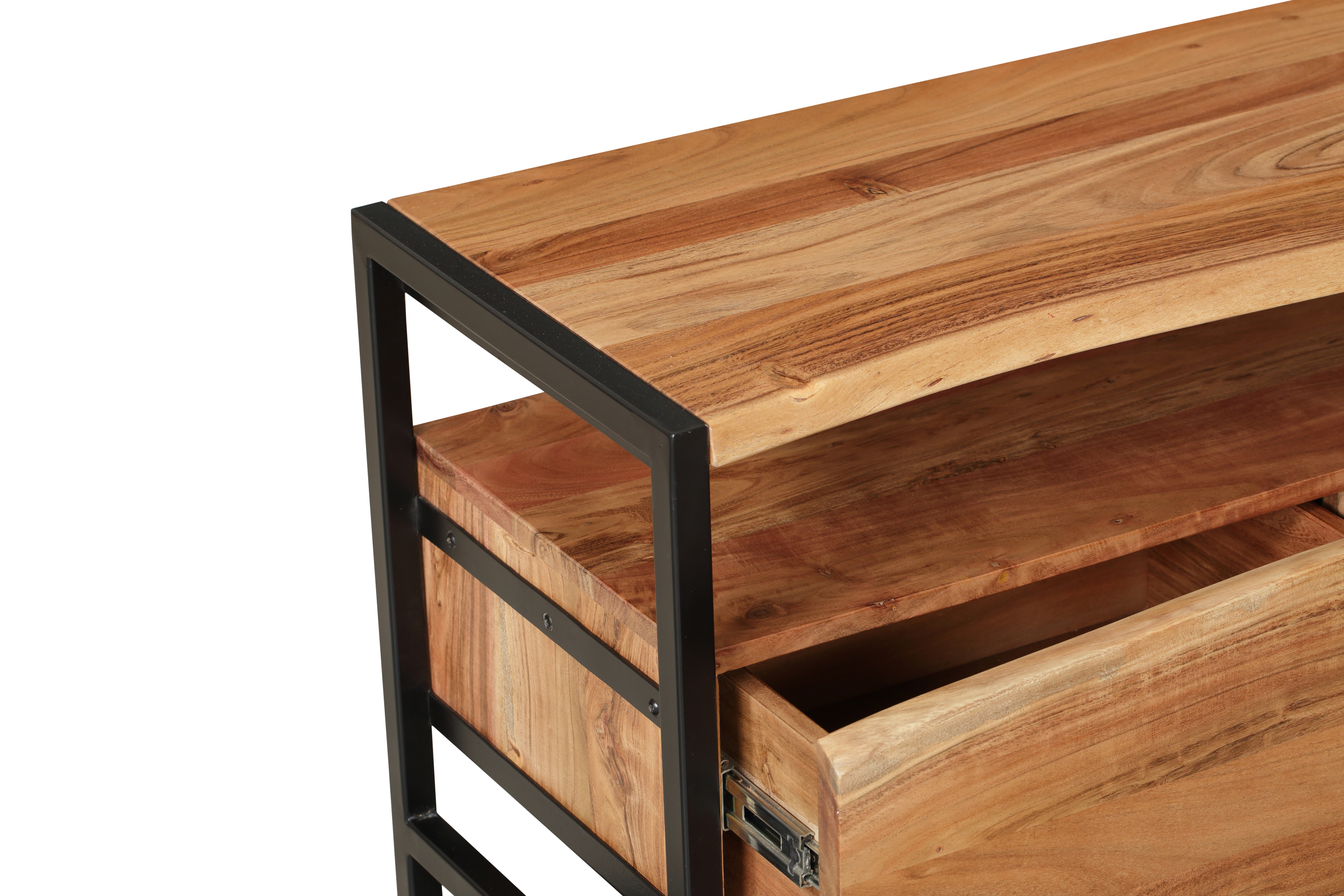 Der TV-Schrank MALA besticht durch eine Kombination aus Akazienholz und pulverbeschichtetem Eisen. Die lackierte Holzoberfläche und die schwarze Metallstruktur verleihen dem Möbelstück eine moderne, industrielle Optik, die sich hervorragend in unterschiedliche Wohnstile integriert. Mit praktischen Ablageflächen bietet der Schrank ausreichend Stauraum für Ihre Elektronik und Zubehör.
