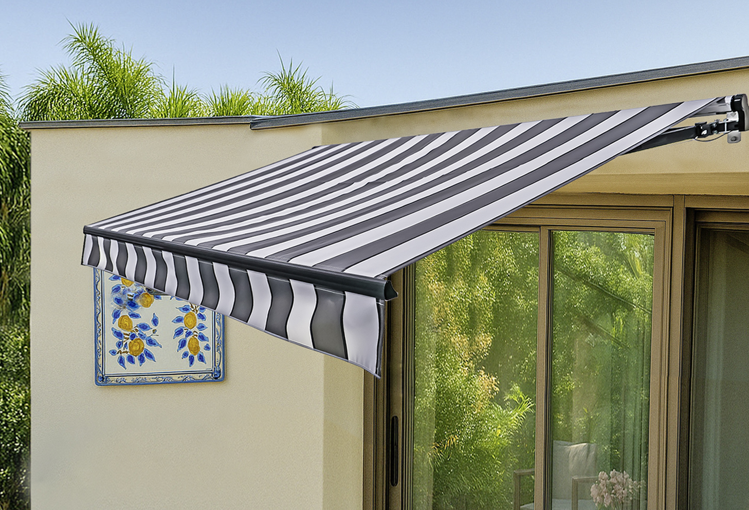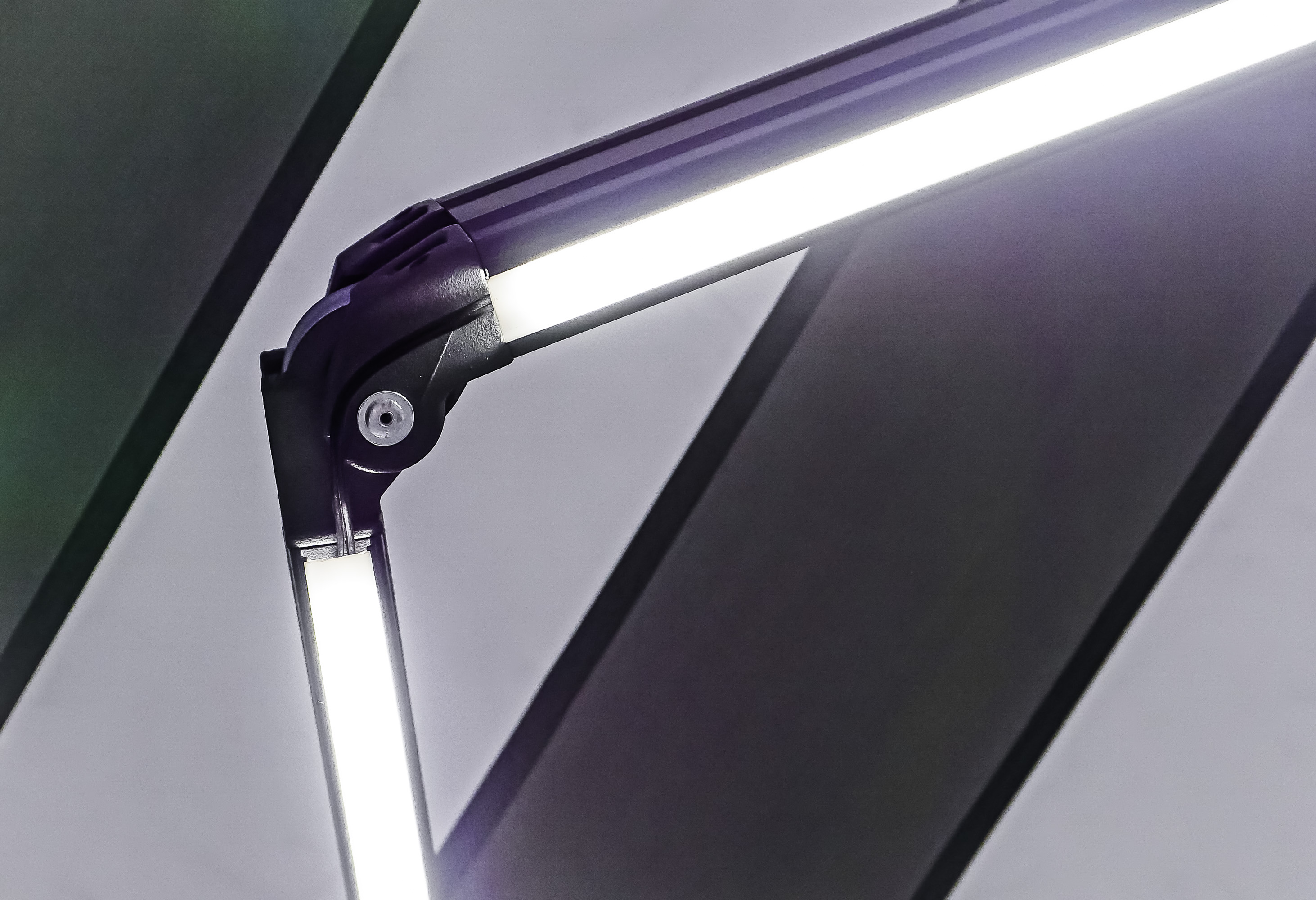Elektrische Gelenkarmmarkise 395x250 cm, mit LED Beleuchtung, motorisiert, hellgrau-weiß gestreift