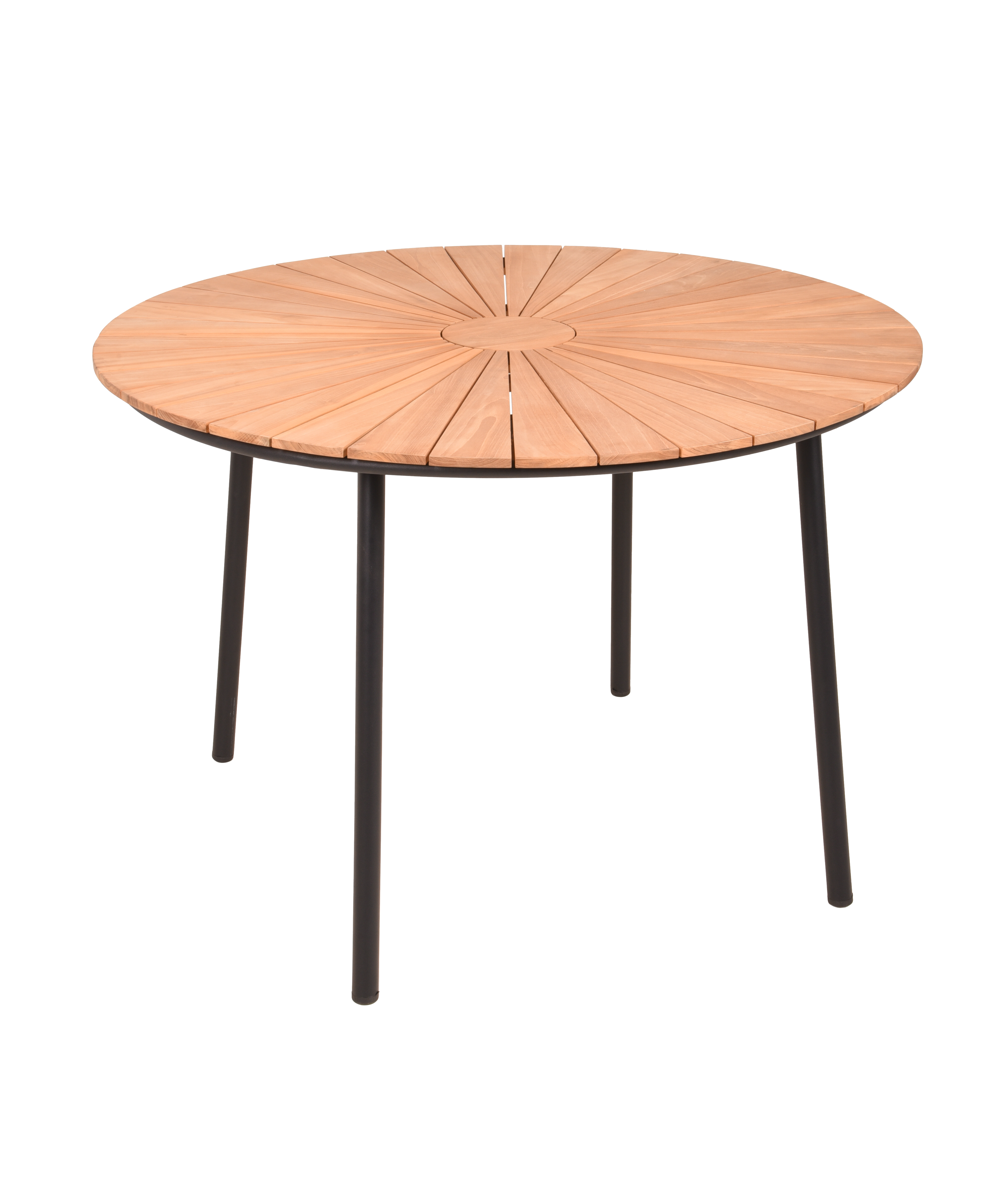 Der runde Tisch COVINA kombiniert hochwertiges Teakholz mit einem stabilen Stahlgestell, das in Schwarz pulverbeschichtet ist. Die Kombination aus Naturholz und robustem Metall verleiht dem Tisch einen modernen und eleganten Look, der sich hervorragend in verschiedene Einrichtungsstile integriert. Ideal für Essbereiche oder als dekorativer Akzent in Ihrem Zuhause.