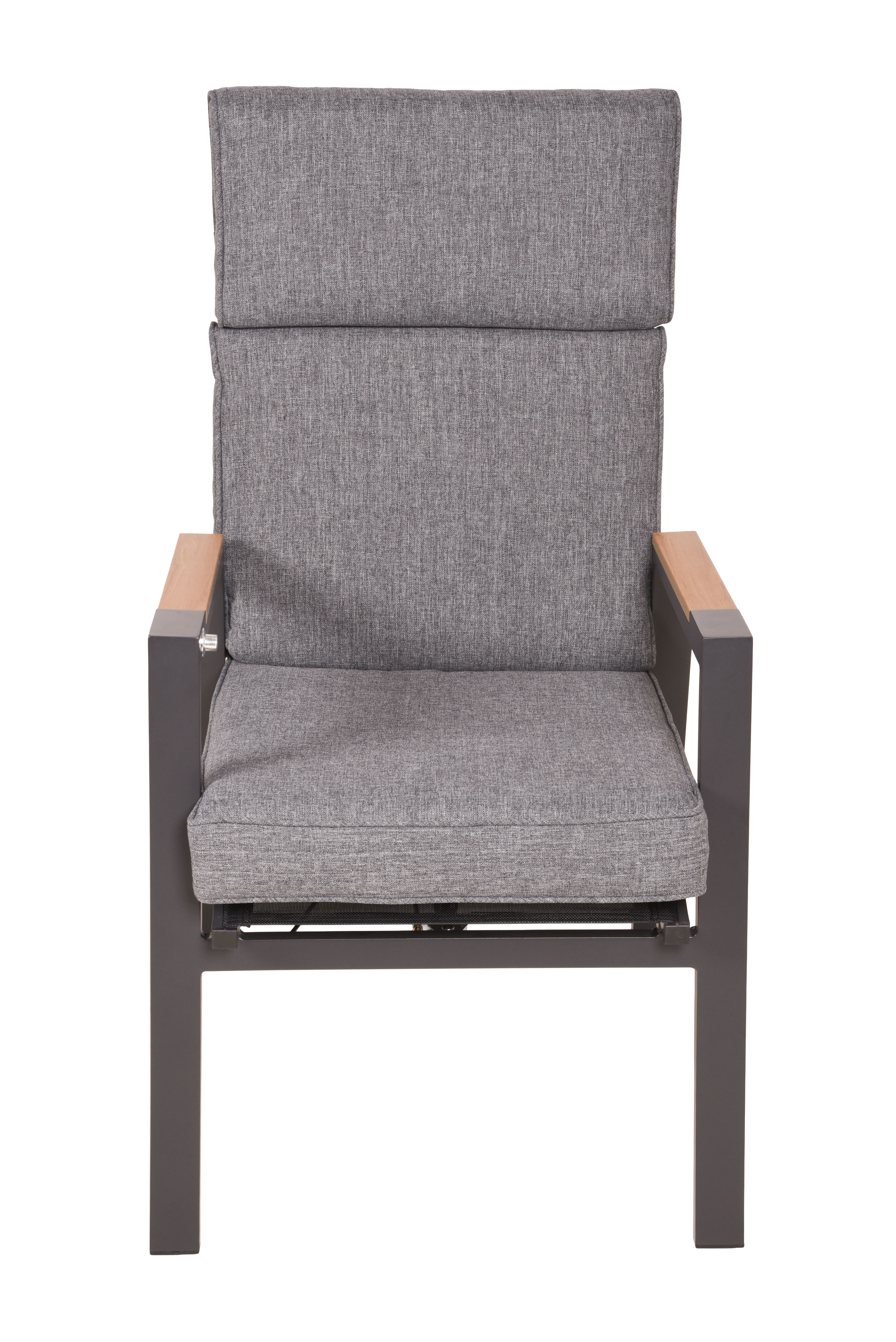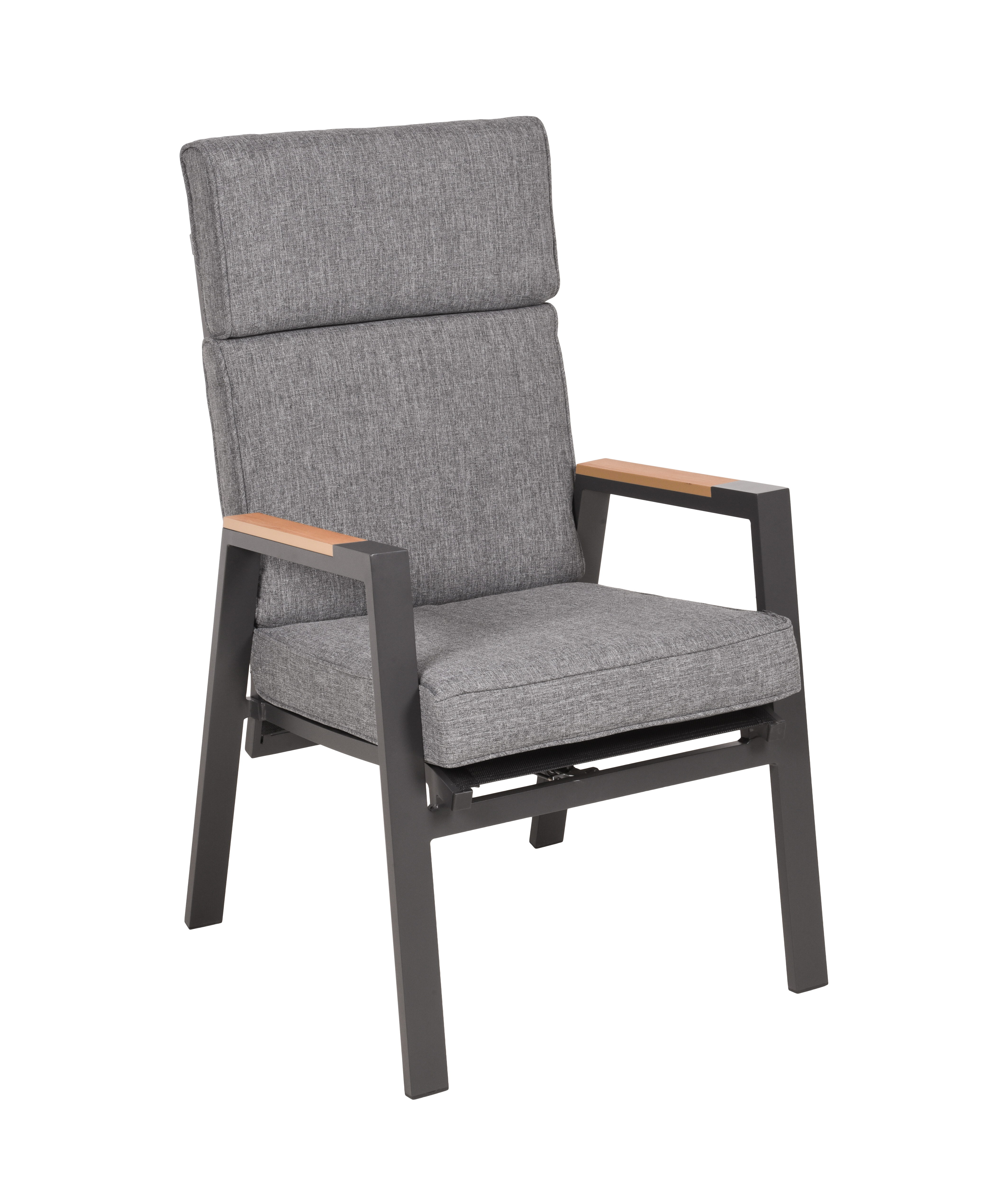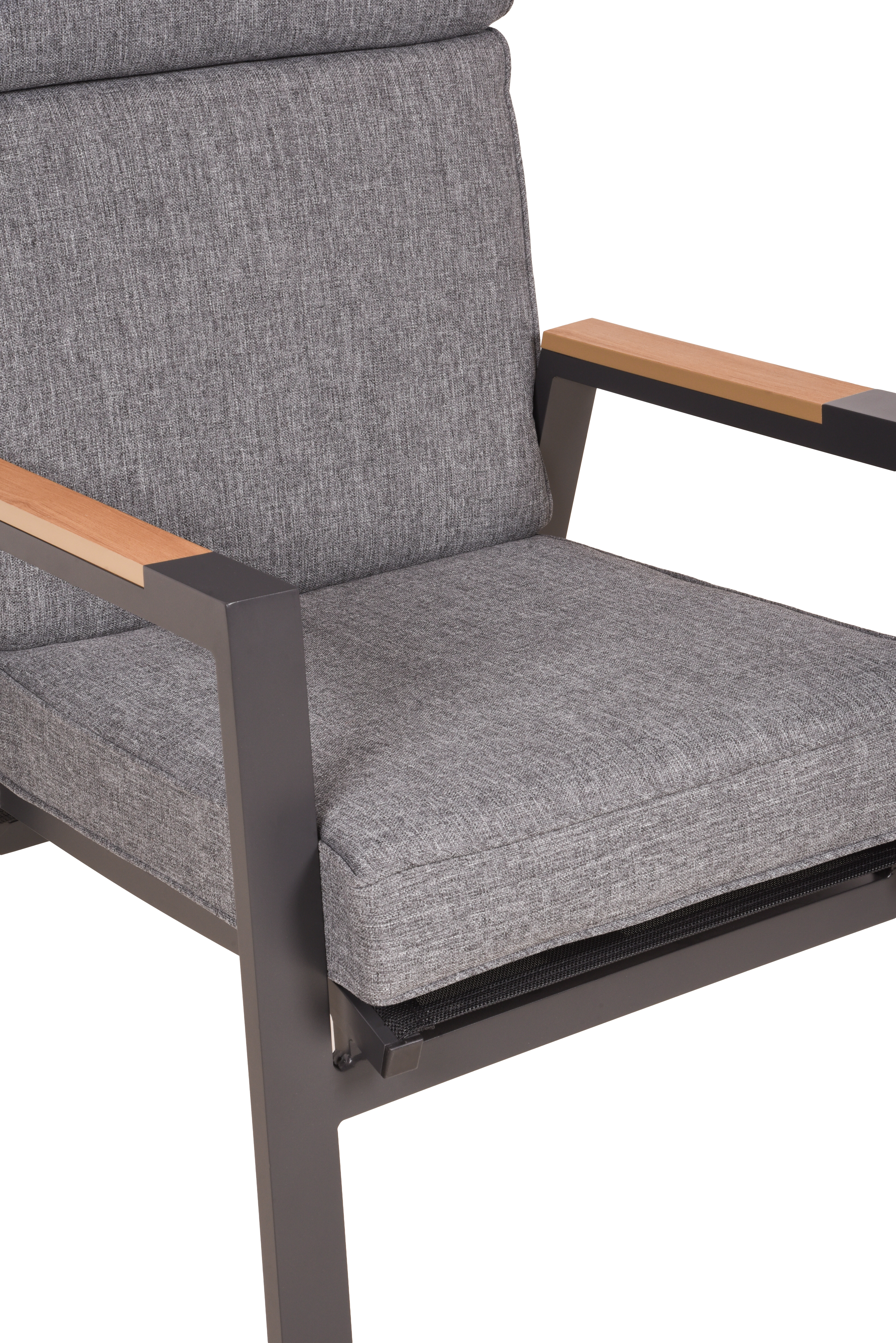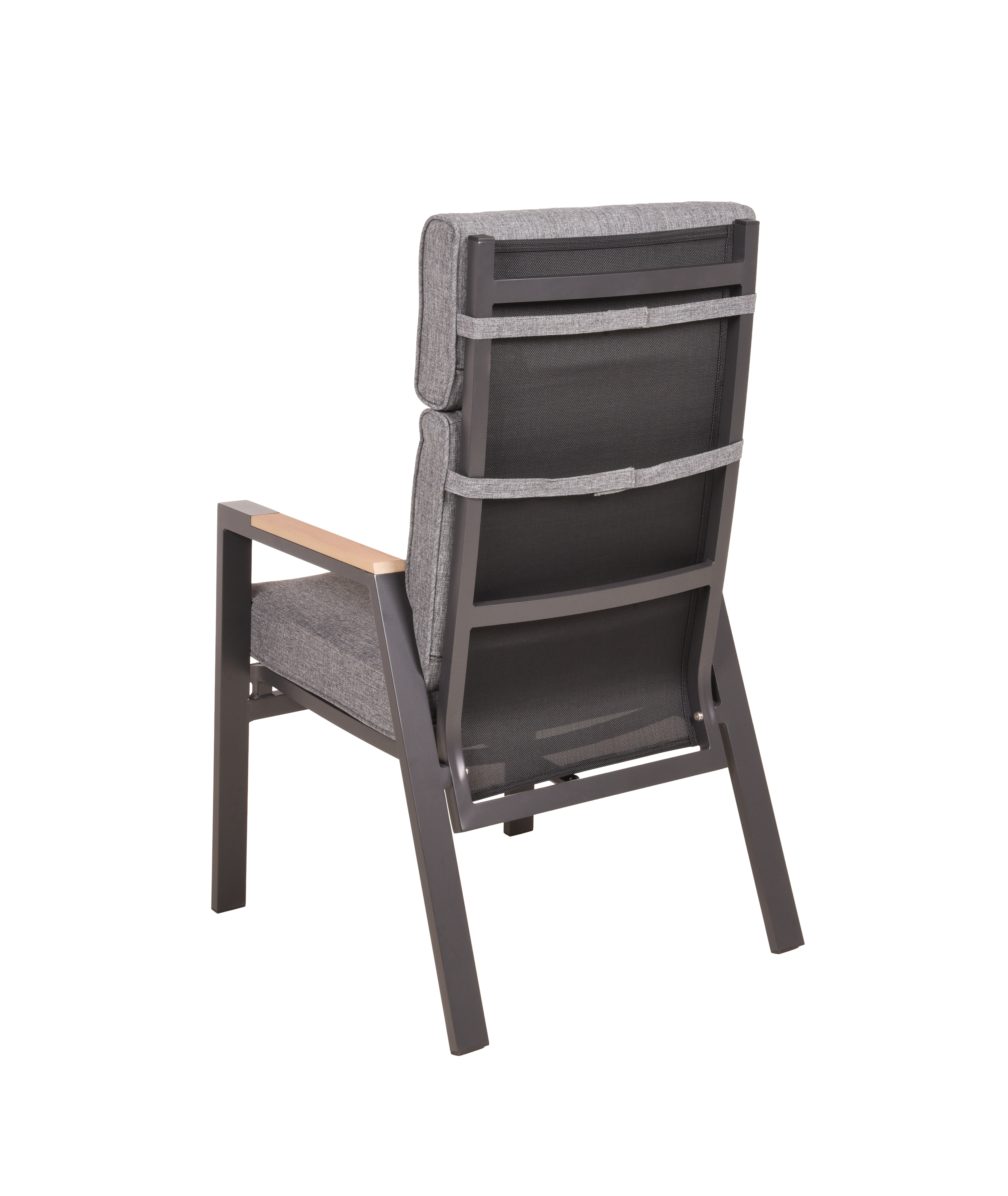 Das leichte, aber stabile Aluminiumgestell ist pulverbeschichtet und dadurch besonders widerstandsfähig gegen Witterungseinflüsse und Korrosion. Die Sitz- und Rückenflächen bestehen aus langlebigem Polywood, das die natürliche Optik von Holz mit den pflegeleichten Eigenschaften von Kunststoff kombiniert. Die atmungsaktive Kunststoffbespannung (2x1) aus 70 % PVC und 30 % Polyester sorgt für angenehmen Sitzkomfort und schnelles Trocknen.