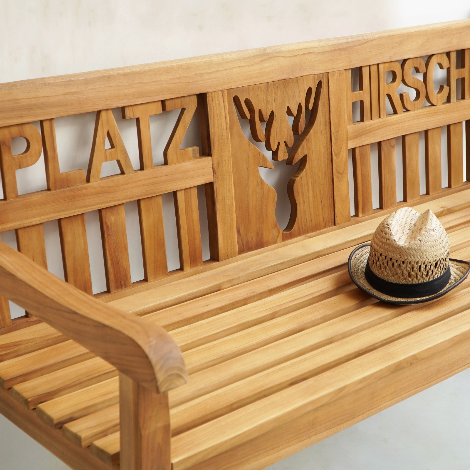 Die Bank PLATZHIRSCH aus massivem Teakholz ist ein echtes Highlight für Garten, Terrasse oder Balkon. Ihr markanter Schriftzug und der kunstvoll ausgeschnittene Hirschkopf verleihen ihr einen unverwechselbaren Charakter. Das natürliche Teakholz sorgt für eine warme, hochwertige Optik und ist gleichzeitig wetterfest sowie langlebig. Eine stilvolle Gartenbank, die Komfort und Design perfekt vereint - ideal für entspannte Stunden im Freien.