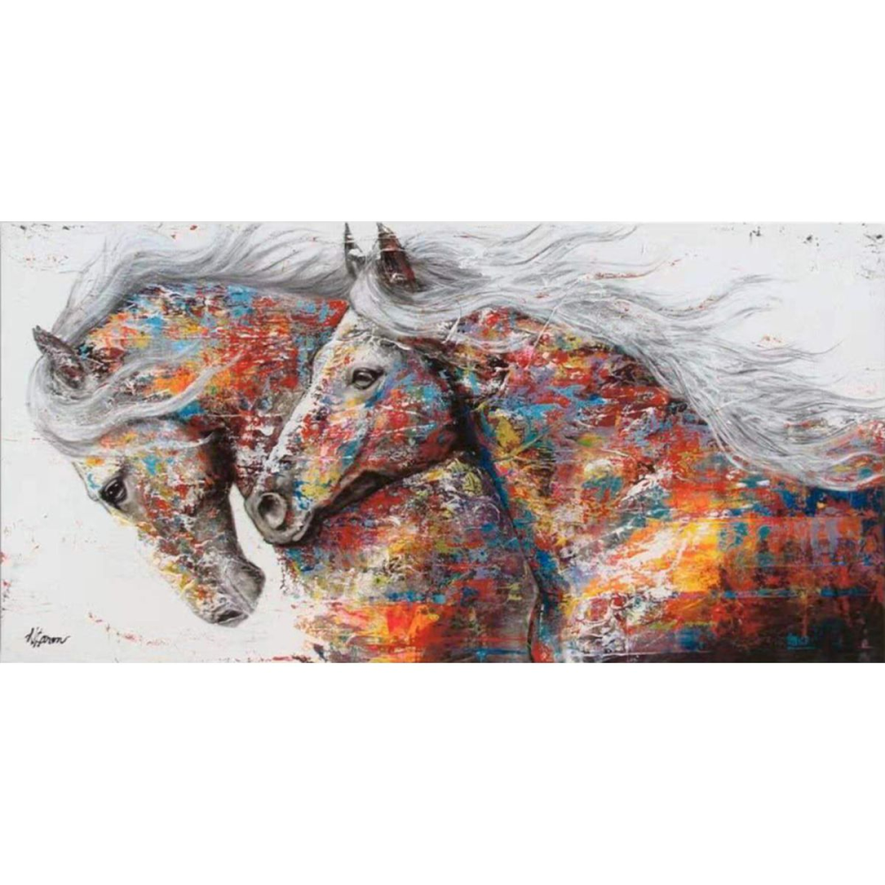 Das 3D Metallbild "2 Pferde" ist ein beeindruckendes Kunstwerk aus buntem Stahl, das mit handgefertigter Malerei veredelt wurde.