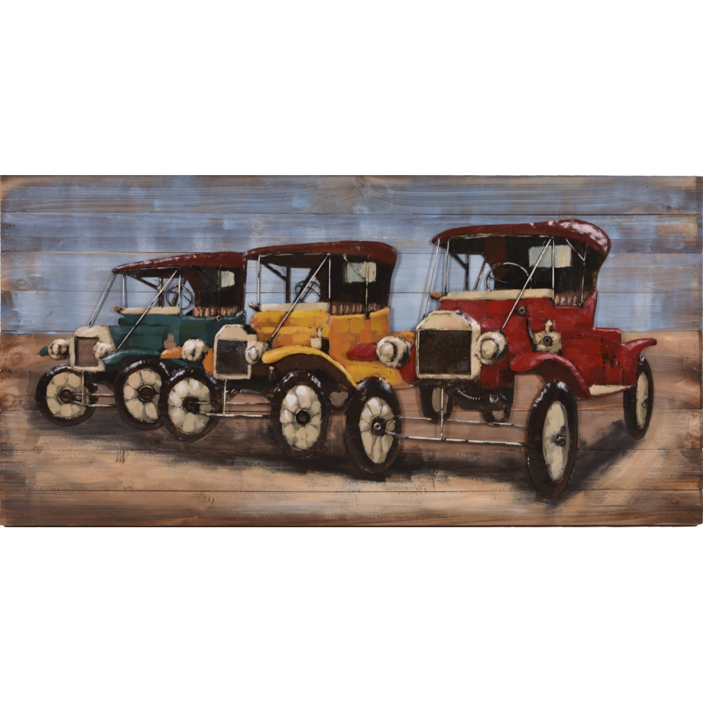Das Kunstwerk ist auf einem Untergrund aus Spießtannenholz montiert, was ihm einen rustikalen und charmanten Look verleiht. Dieses Bild ist perfekt für Liebhaber von klassischen Autos und Nostalgie.
