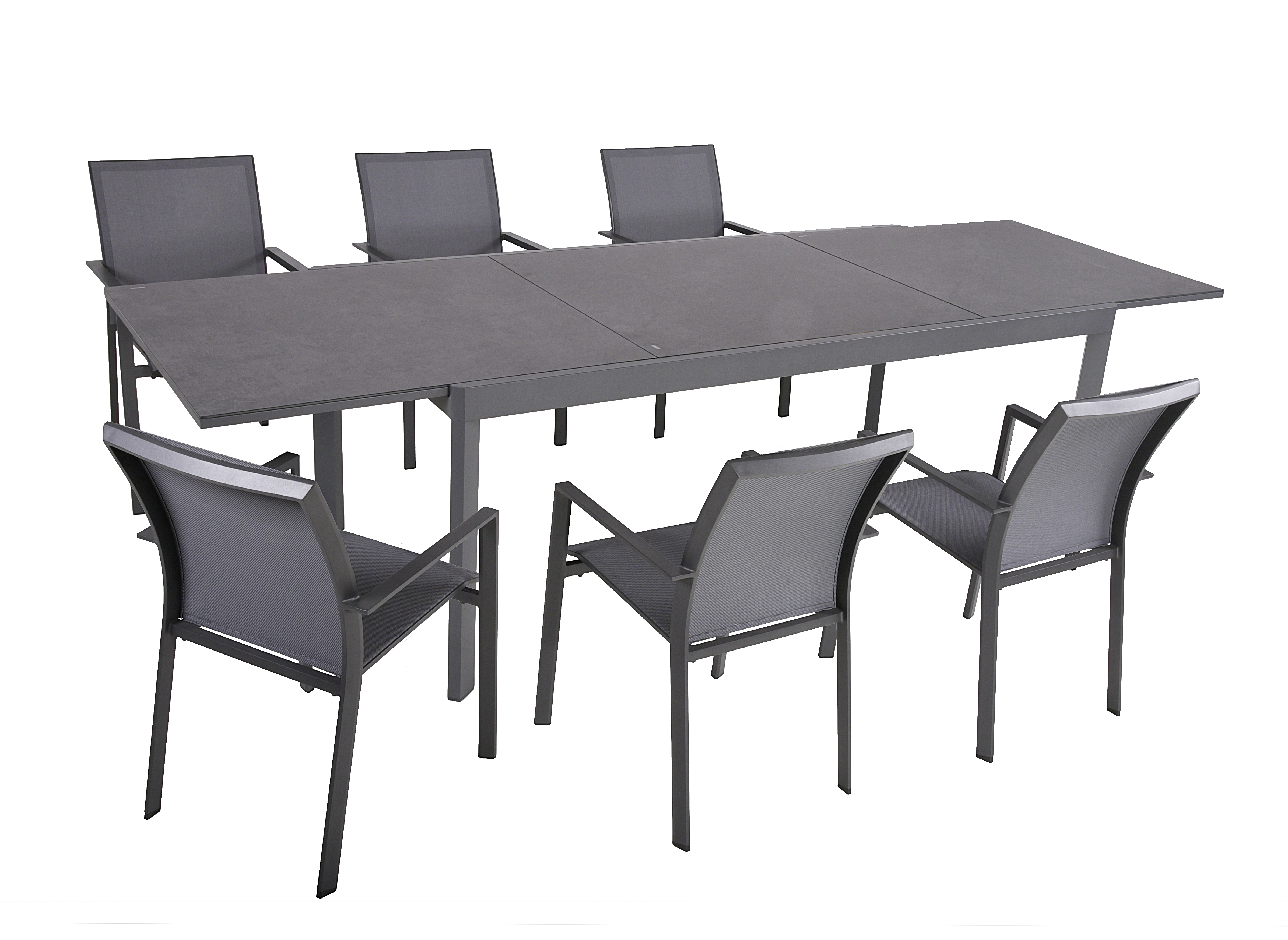 Der stapelbare Armstuhl GETAFE vereint zeitgemäßes Design mit hervorragendem Komfort und ist die ideale Wahl für Ihren Innen- und Außenbereich. Hergestellt aus strapazierfähigem Aluminium und einem hochwertigen Kunststoffgeflecht in einem ansprechenden Dunkelgrau, bringt dieser Stuhl eine moderne Eleganz in Ihre Wohn- oder Außenbereiche.