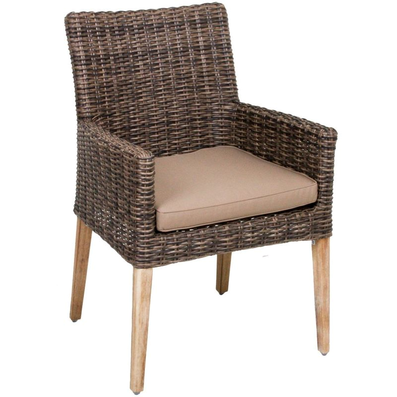 Das hellbraune Kunststoffgeflecht sorgt nicht nur für eine attraktive Textur, sondern bietet auch zusätzliche Stabilität. Der NORVELL Armstuhl ist mit einer beigen Sitzauflage aus 100% Polyester ausgestattet, die nicht nur bequem ist, sondern auch einen Hauch von Eleganz verleiht.