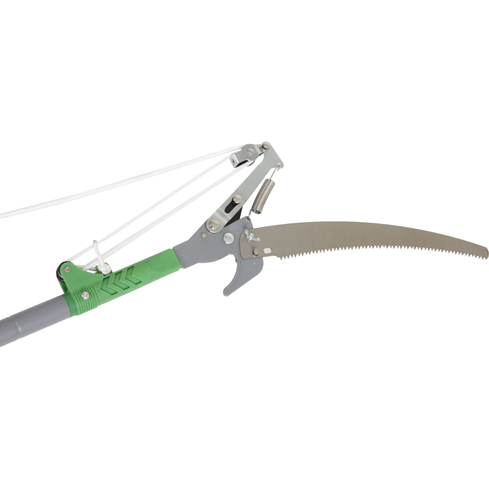 Der Teleskopgriff ist ausziehbar und besteht aus robustem grünem Kunststoff, was es Ihnen ermöglicht, höher gelegene Äste bequem zu erreichen, ohne eine Leiter zu verwenden.