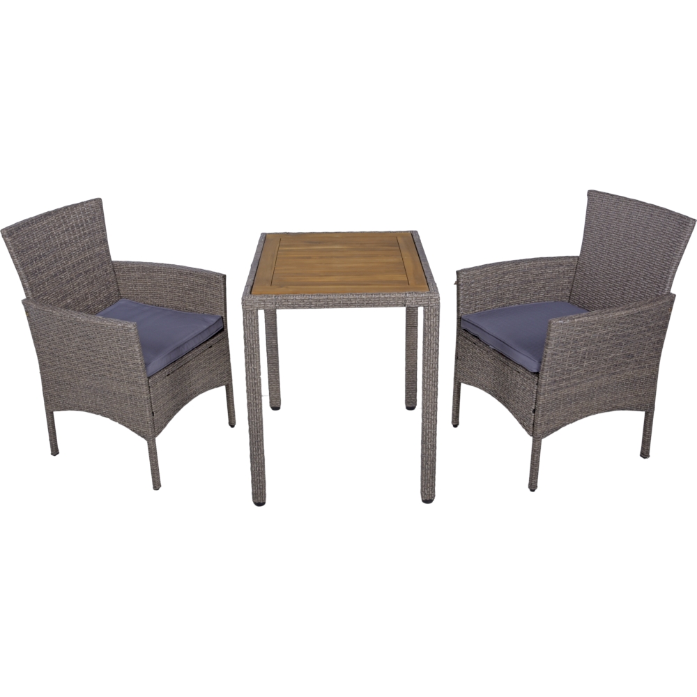 Der dazugehörige Tisch verfügt über eine Tischplatte aus Akazienholz, die dem Set einen natürlichen und warmen Touch verleiht. Das Akazienholz ist bekannt für seine Haltbarkeit und Witterungsbeständigkeit und sorgt dafür, dass der Tisch den Elementen standhält. Die Tischplatte bietet ausreichend Platz für Getränke, Snacks oder Ihr Lieblingsbuch.