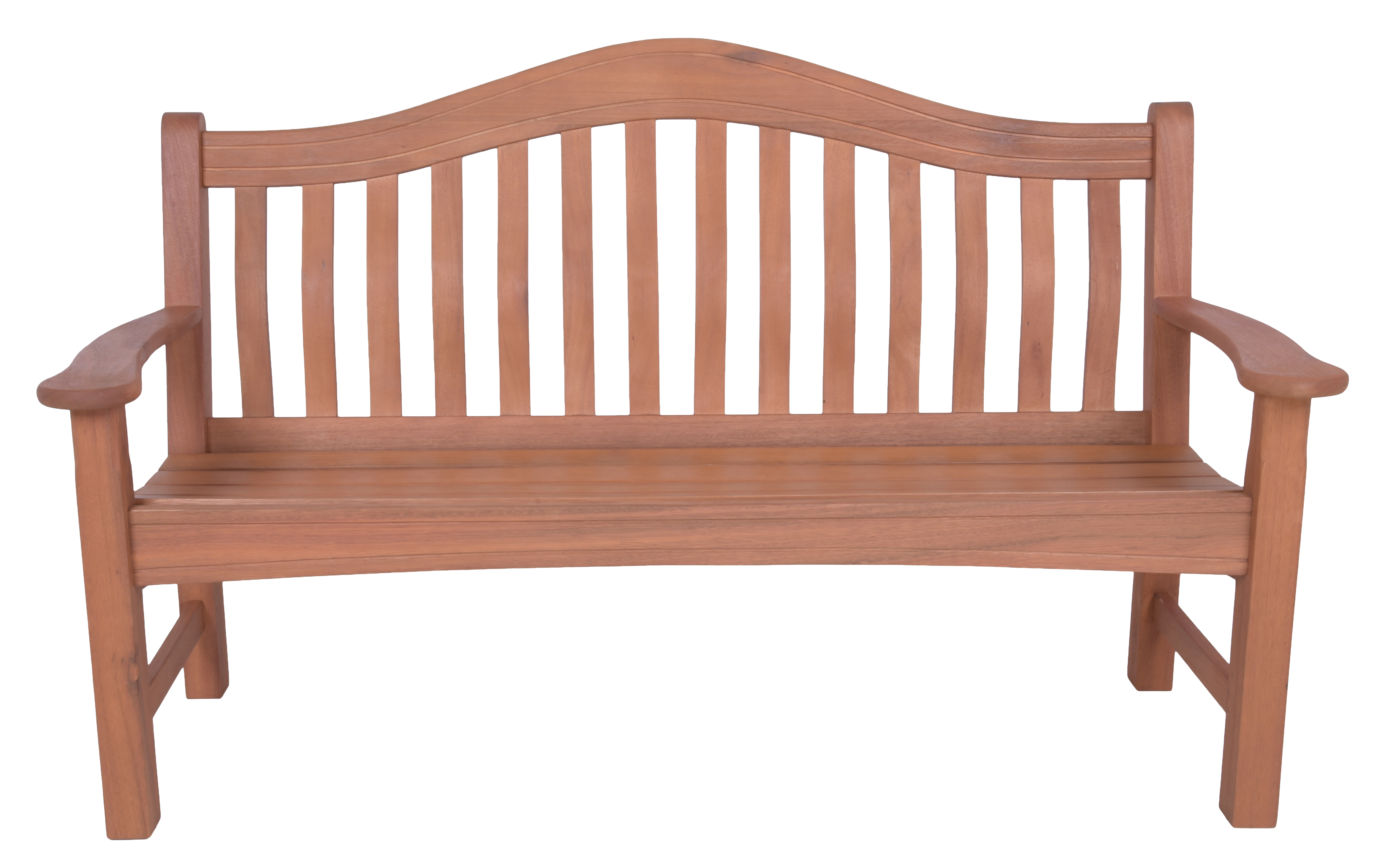 Durch das mittelrot geölte Eukalyptusholz erinnert die Bank mit großzügigen Armauflagen an Teakholz.