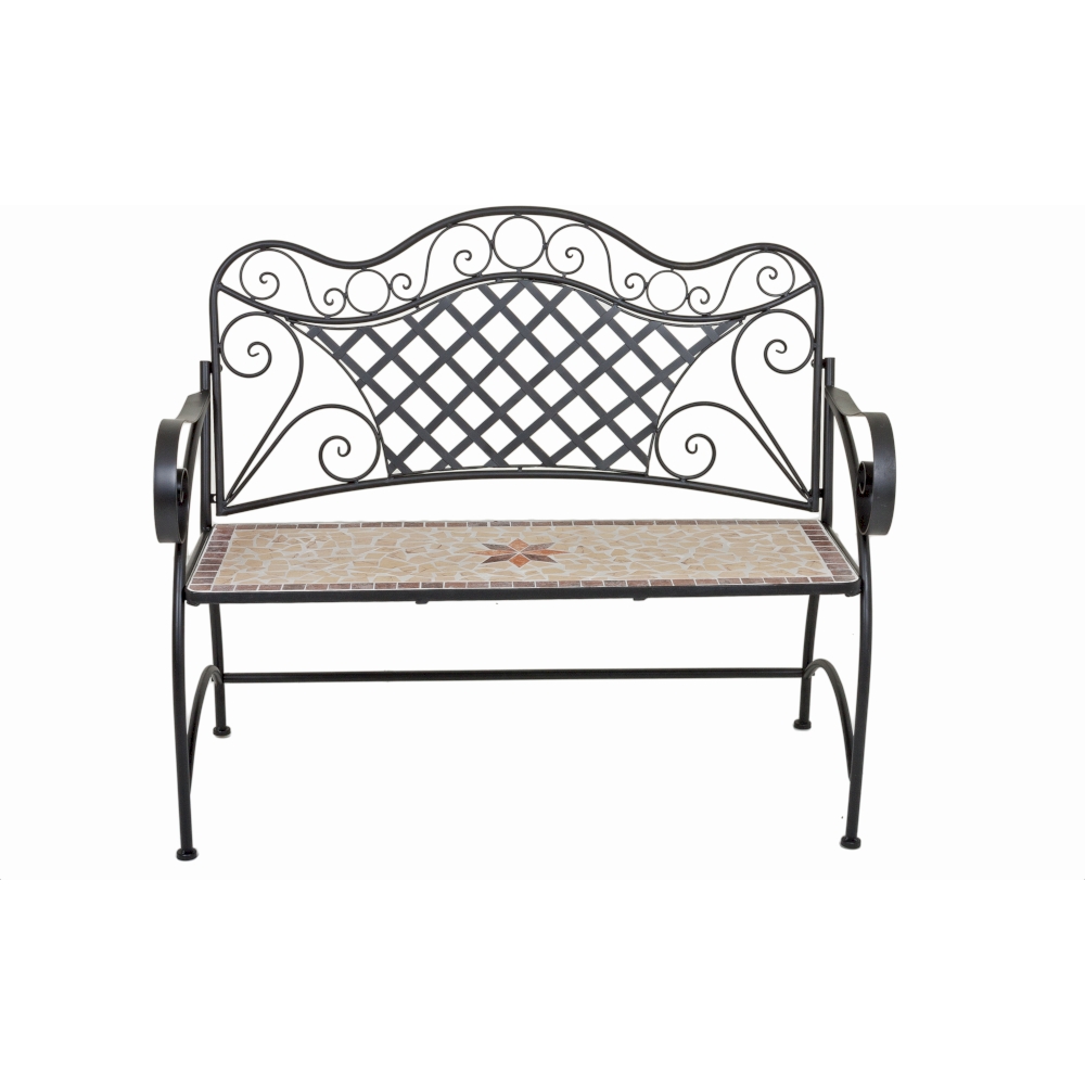 Herrliche Momente im heimischen Grün verspricht die Bank Amarillo, welche mit einem Mosaik in der Sitzfläche aus rotbrauner, ocker und beigefarbiger Keramik als dekorativer Blickfang im Aussenbereich glänzt.