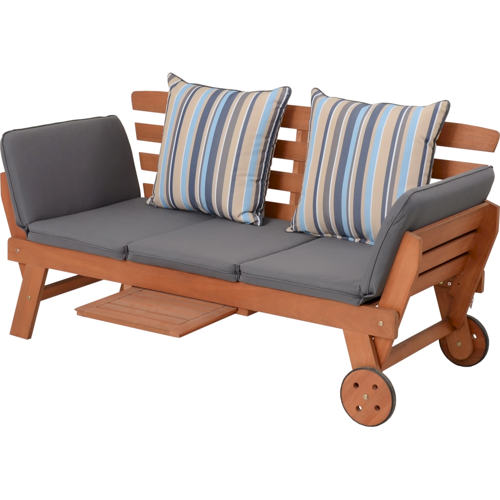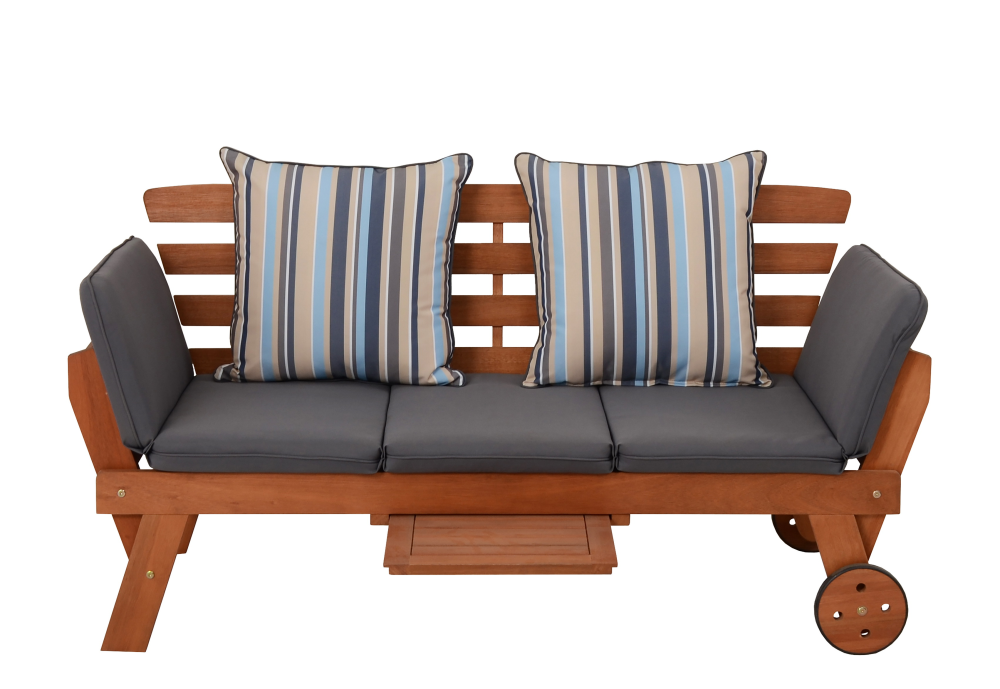Die im Lieferumfang enthaltene grau gestreifte Auflage aus Polyester sorgt nicht nur für zusätzlichen Komfort, sondern verleiht der Bank auch einen modernen und ansprechenden Look.