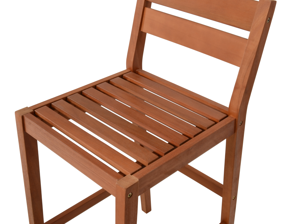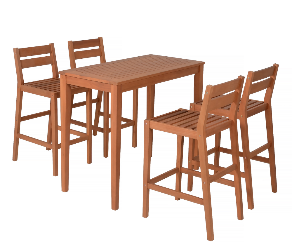 Dieses Set enthält einen Tisch und vier Stühle, alle aus 100% FSC-zertifiziertem Eukalyptusholz gefertigt, das in einem warmen Braunton geölt ist.