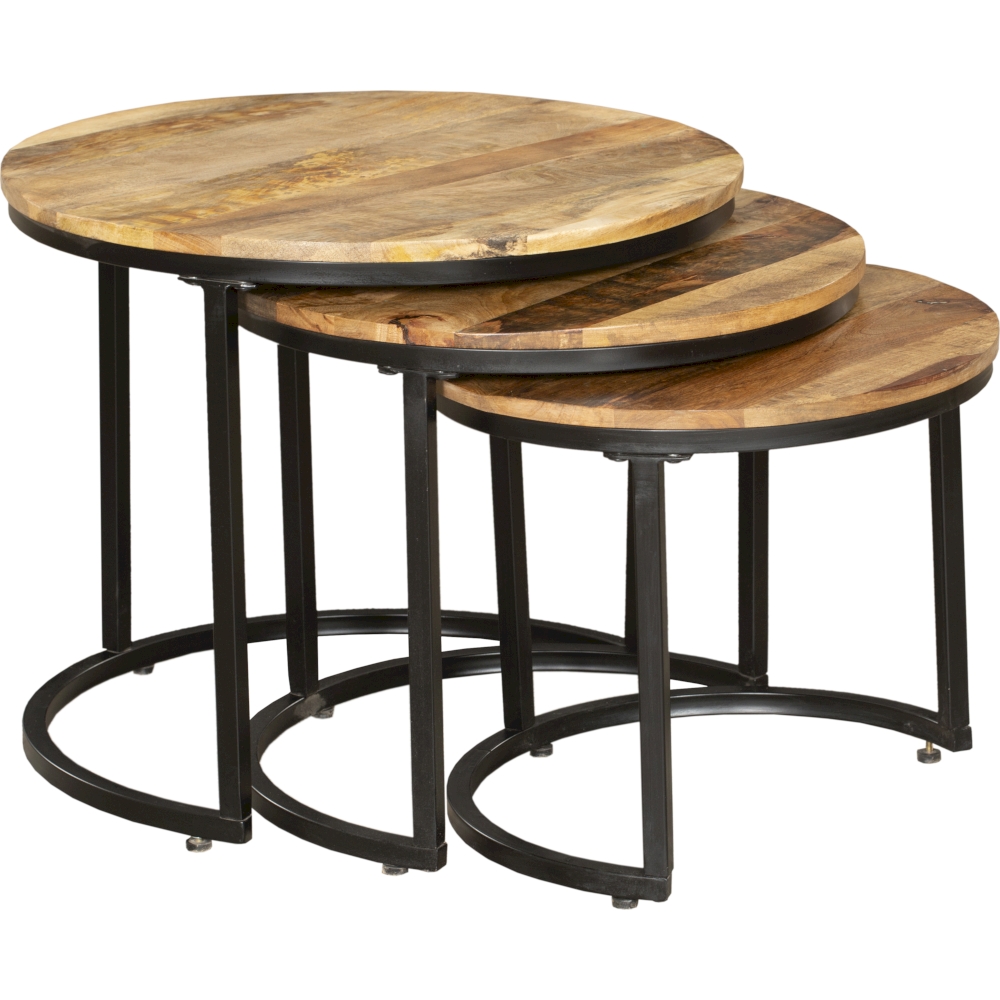 Die Tischplatten sind aus Massivholz (Recyceltes Mangoholz massiv, Oberfläche lackiert) und das Gestell ist jeweils aus schwarzem Stahl (pulverbeschichtet).