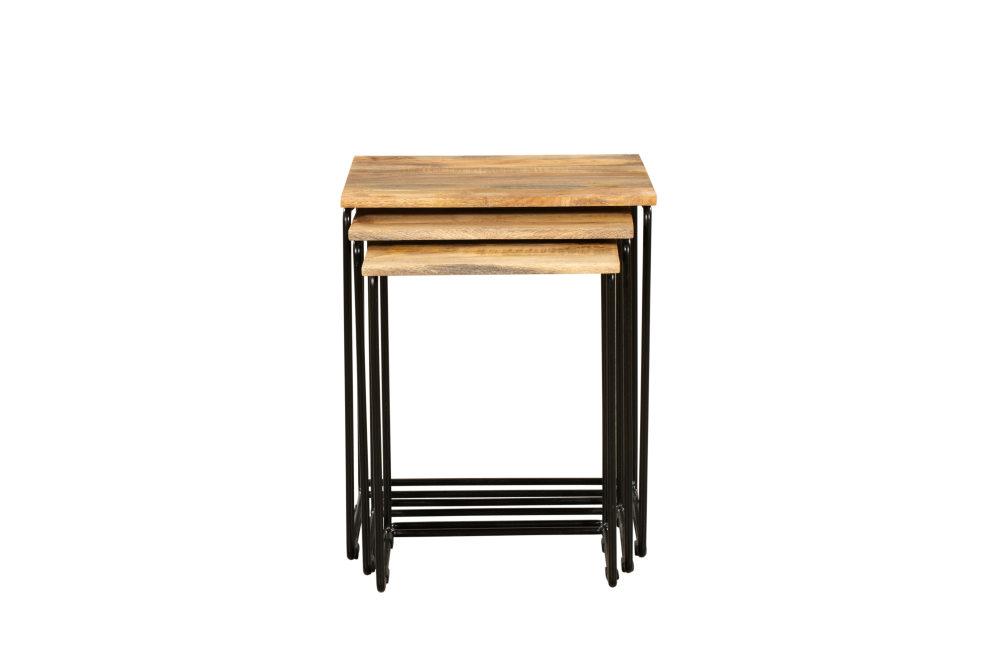 Die Tischplatten sind aus Massivholz (Recyceltes Mangoholz massiv, Oberfläche lackiert) und das Gestell ist jeweils aus schwarzem Stahl (pulverbeschichtet).