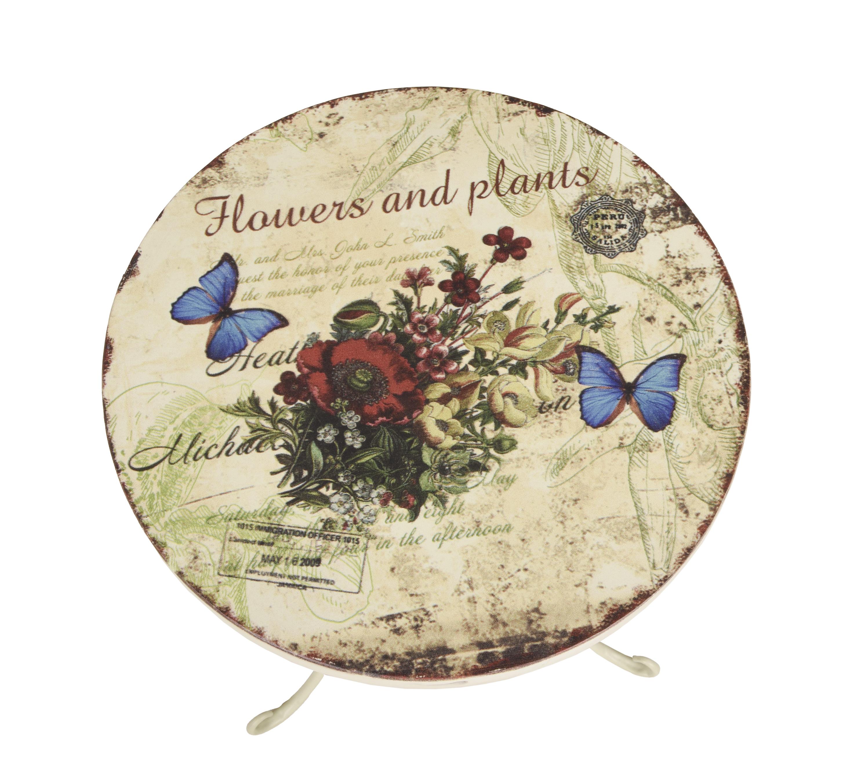 Das Highlight des Tisches ist das aufgedruckte Motiv auf der Tischplatte, auf dem zwei wunderschöne blaue Schmetterlinge und ein bunter Blumenstrauß zu sehen ist.