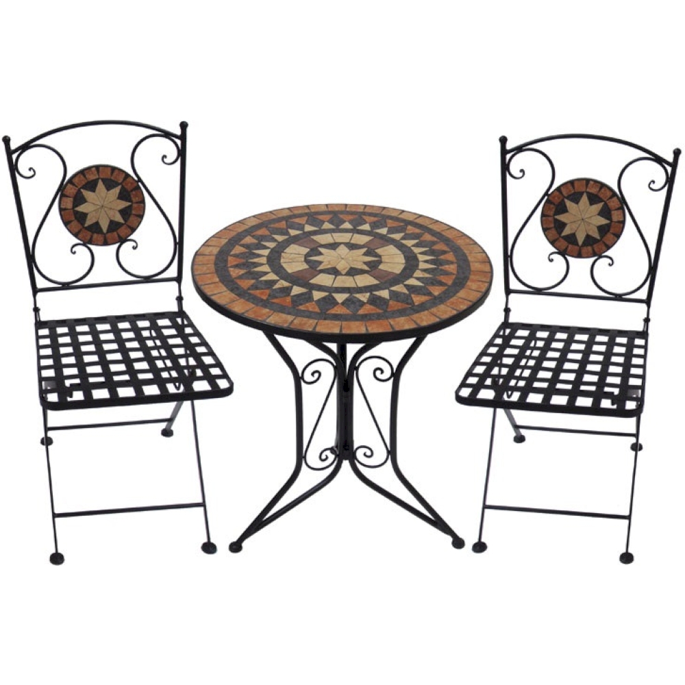 Die Tischplatte und die Rückenfläche der Stühle sind aus Keramik in einer wunderschönen Mosaik-Optik gestaltet.