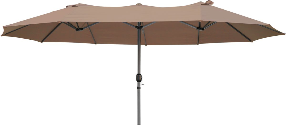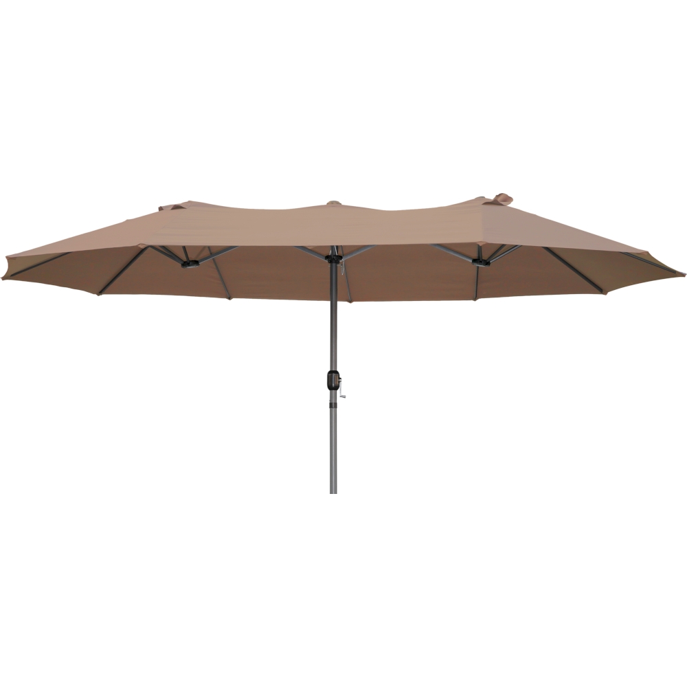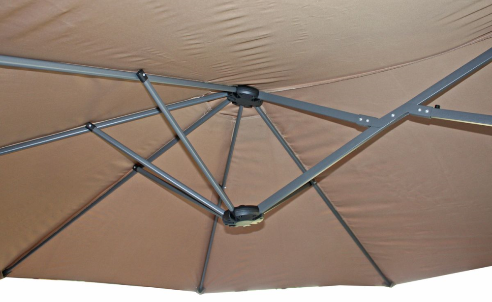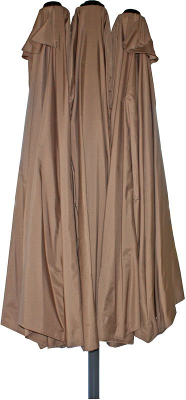 Das Dach des Doppel-Sonnenschirms besteht aus hochwertigem hellbraunem Polyester, das nicht nur vor UV-Strahlen schützt, sondern auch leicht zu reinigen ist. Der Sonnenschirm bietet ausreichend Schatten und Platz, um Ihre Gartenmöbel oder Lounge-Bereiche abzudecken, und eignet sich perfekt für gesellige Zusammenkünfte im Freien.