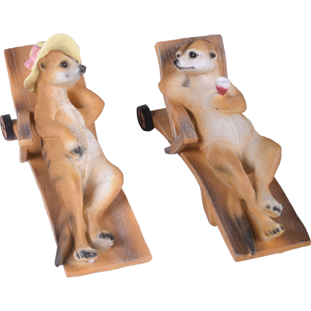 Diese charmanten Erdmännchen-Figuren "Chilli & Willi" auf ihren Liegen sind eine witzige und unterhaltsame Ergänzung für Ihre Garten- oder Außendekoration. Das Set enthält zwei verschiedene Erdmännchen, von denen jedes einen eigenen, individuellen Charme und Stil ausstrahlt.