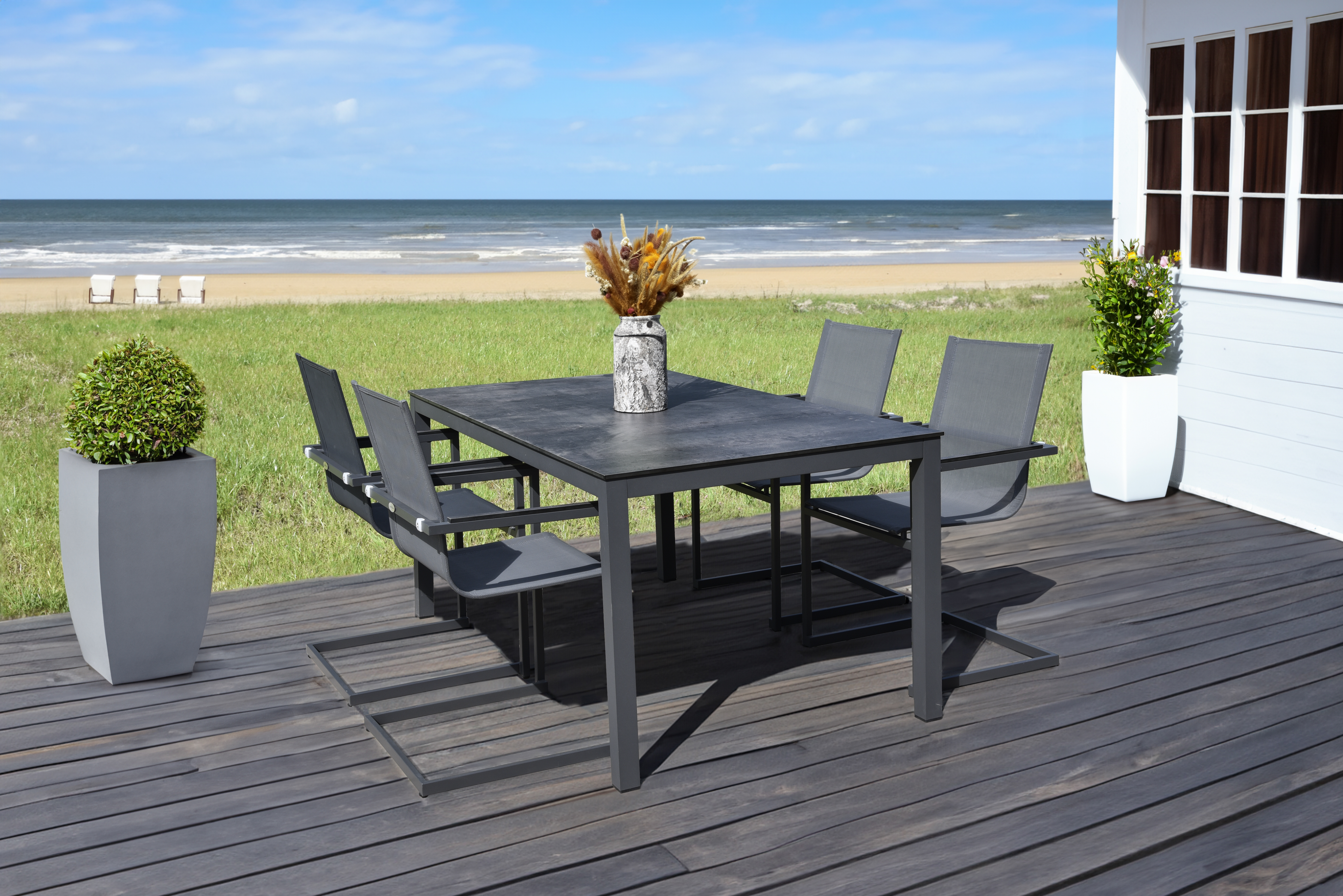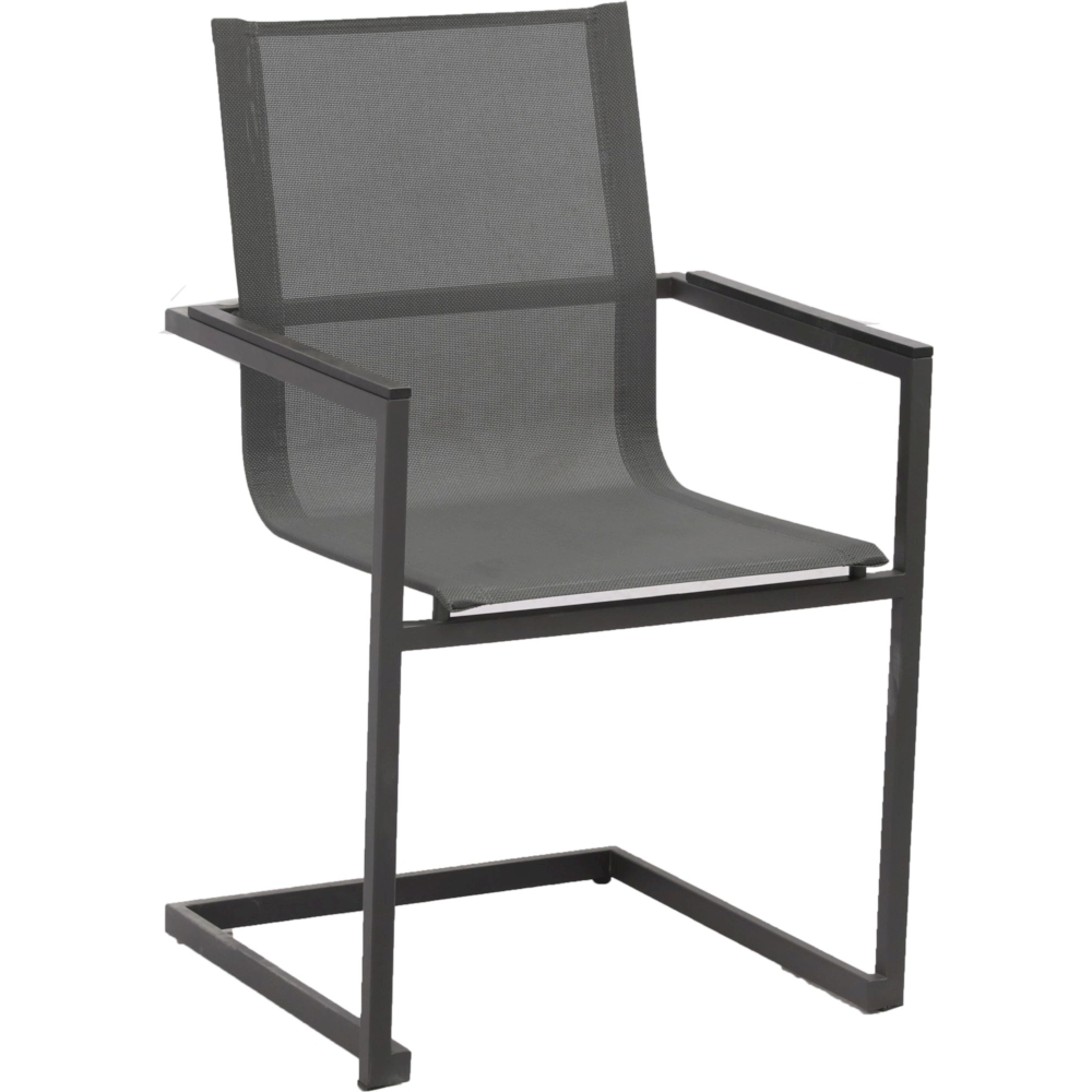 Die Sitz- und Rückenflächen des Stuhls sind mit grauem Kunststoffgewebe bezogen, das nicht nur bequem ist, sondern auch wetterbeständig und pflegeleicht. Das 2x2-Muster verleiht dem Stuhl eine moderne Optik und sorgt gleichzeitig für Belüftung und Komfort.