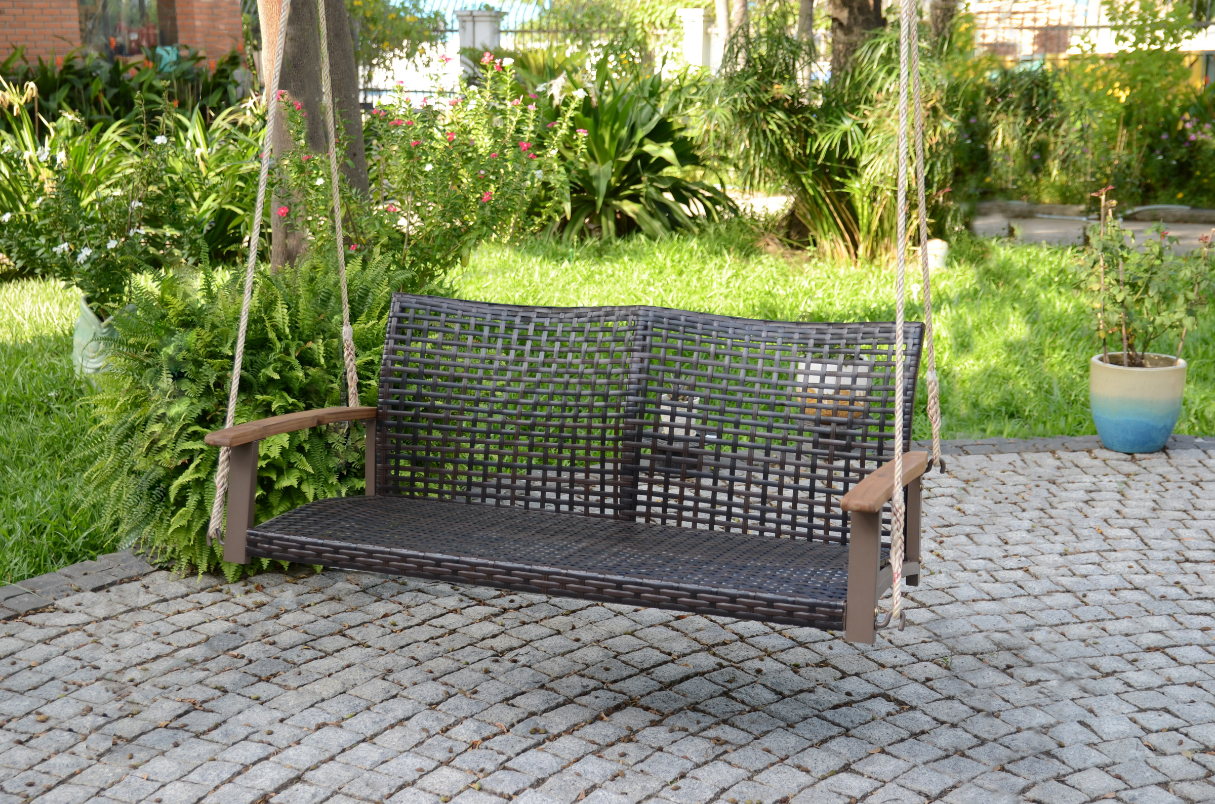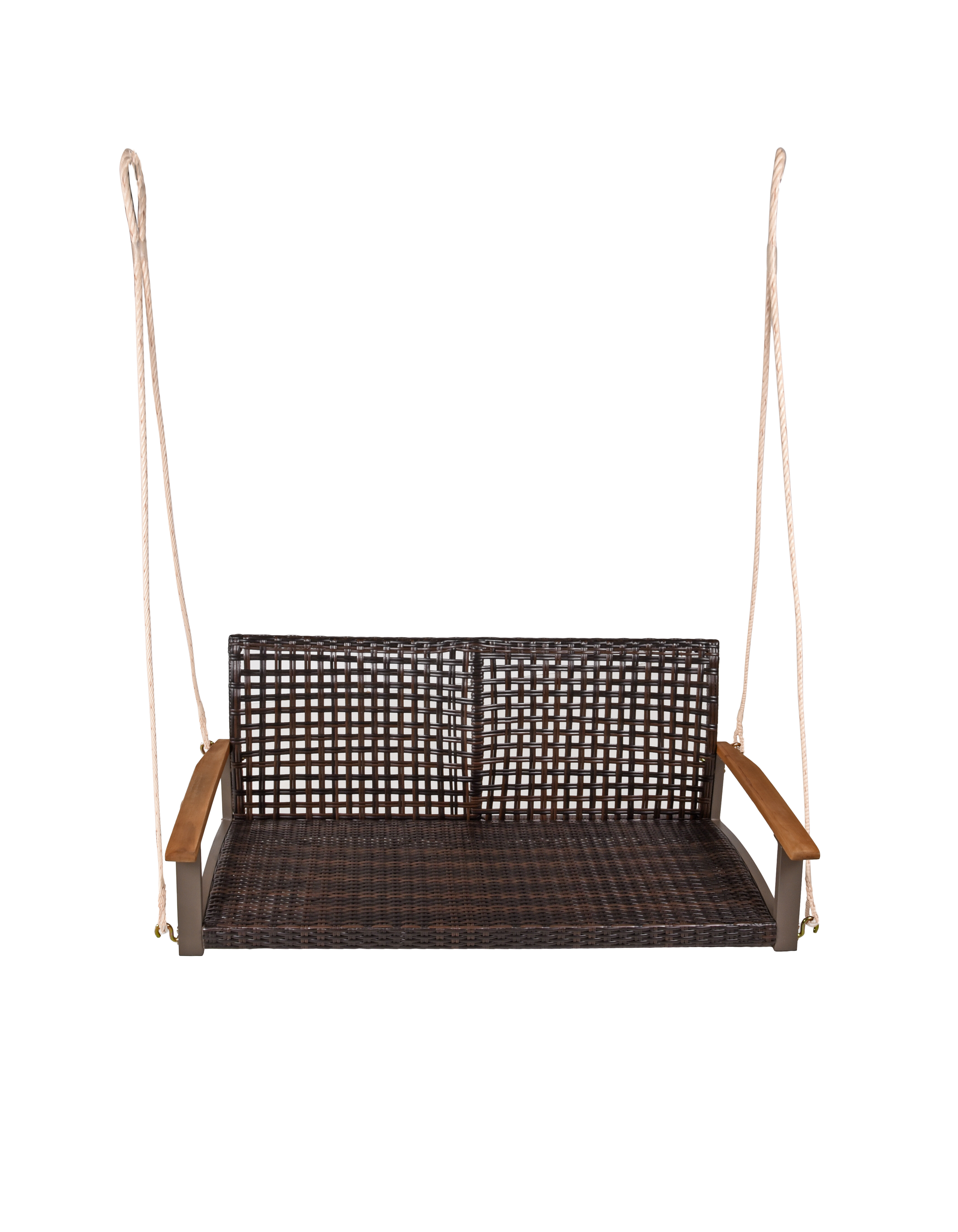 Diese Hängebank verfügt über ein Gestell aus robustem Stahl, eine bequeme Bespannung aus strapazierfähigem Kunststoffgeflecht und praktische Armlehnen aus Akazienholz.