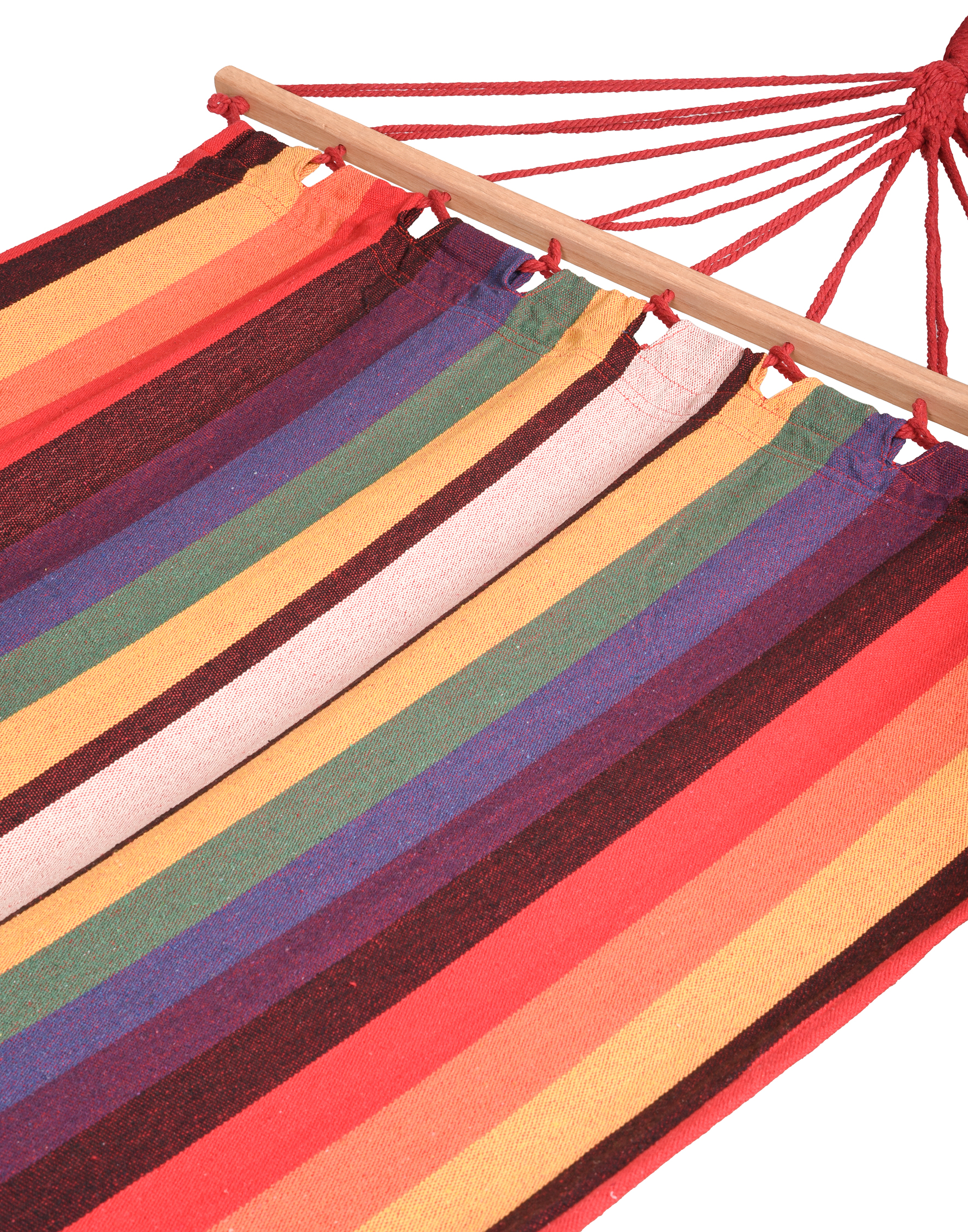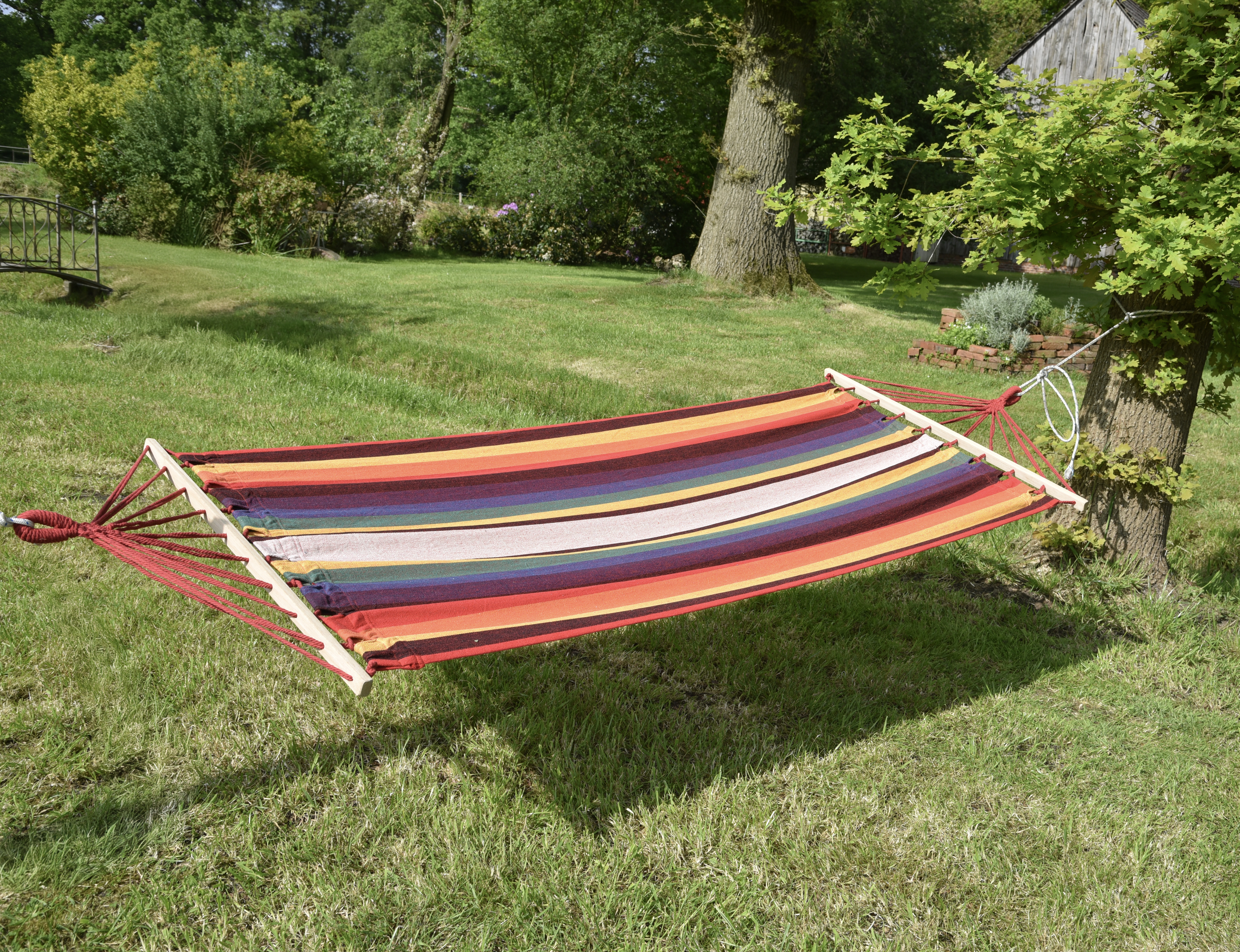Die Hängematte HAWAII aus einem bunten Polyester-Baumwoll-Mix ist die perfekte Wahl für eine bequeme und farbenfrohe Entspannung im Garten.