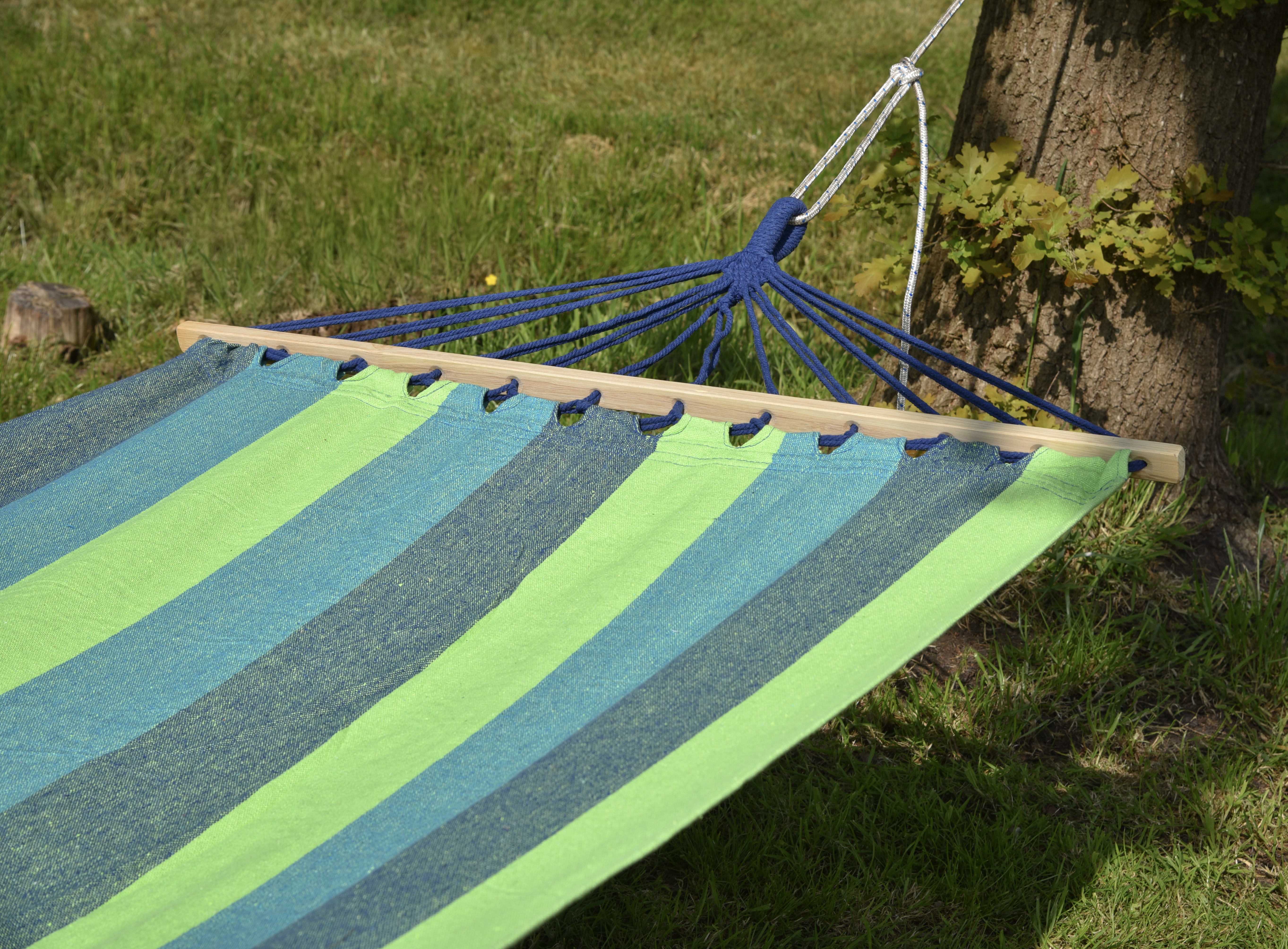 Die Hängematte HAWAII aus einem Polyester-Baumwoll-Mix ist die perfekte Wahl für eine bequeme Entspannung im Garten.