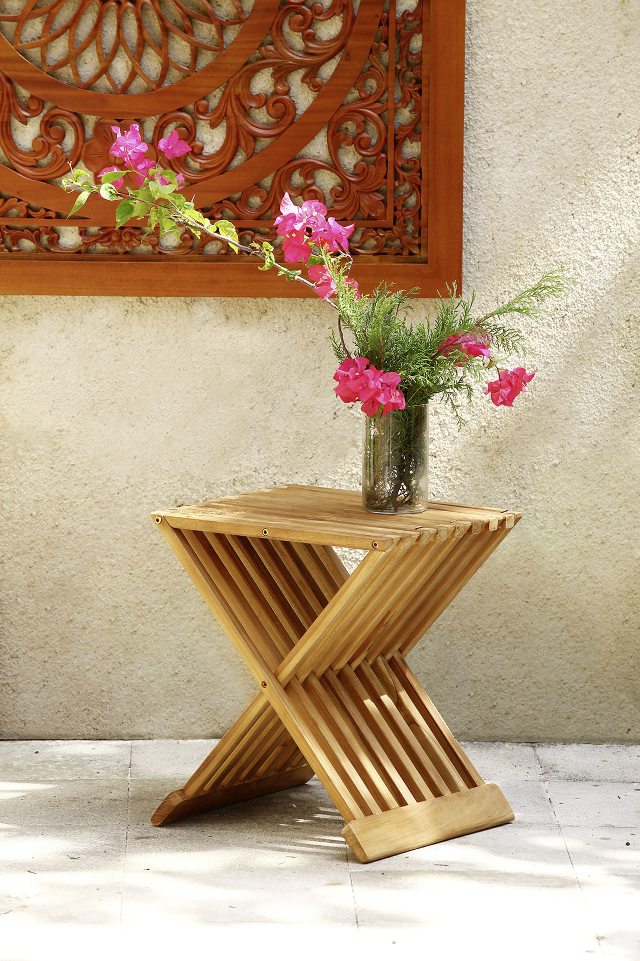 Das Teakholz, aus dem der Hocker Beistelltisch FANI gefertigt wurde, ist bekannt für seine Langlebigkeit und Witterungsbeständigkeit.