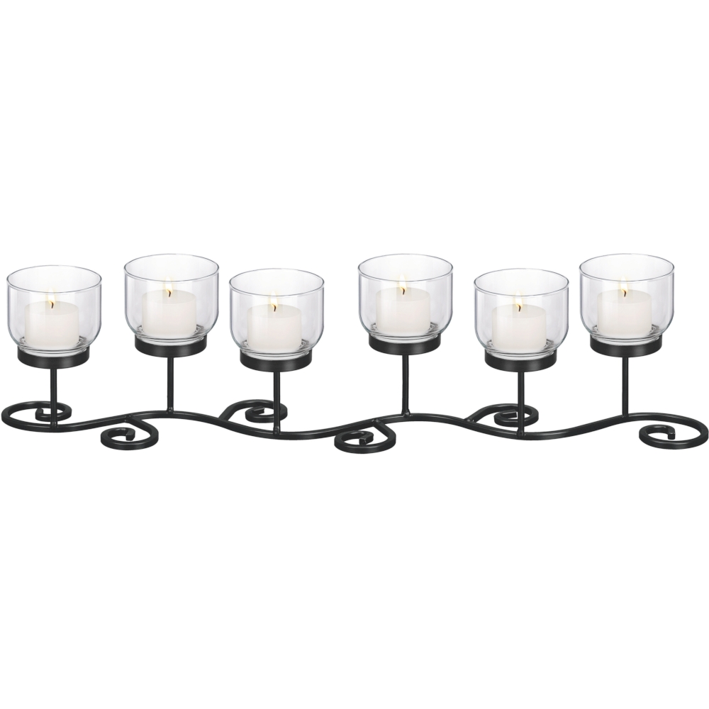 Unser Kerzenhalter mit Platz für sechs Teelichter in Glasbehältern ist ein elegantes und praktisches Accessoire für Ihre Wohnraumgestaltung. Der Metallständer in zeitlosem Schwarz verleiht diesem Kerzenhalter eine moderne Ästhetik und Stabilität.