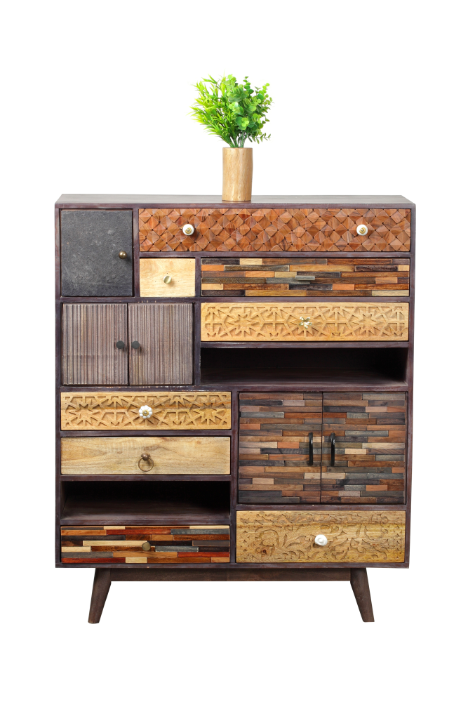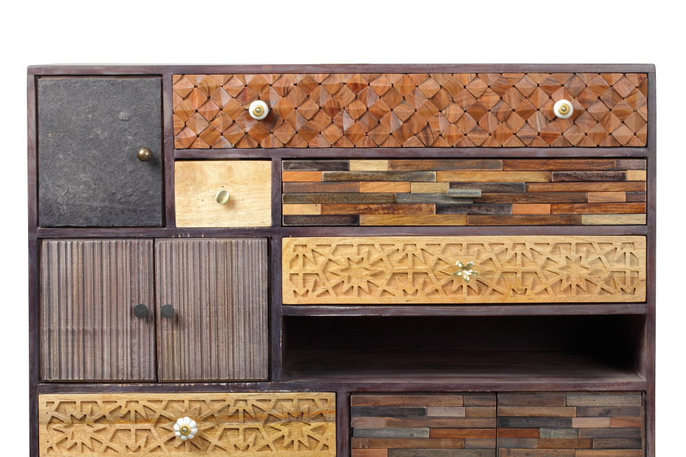 Unsere Kommode TOBOL mit ihrer ausdrucksstarken Optik (Unikat-Look) aus mehreren Materialien (Akazie & Mango massiv recycled, MDF, Oberfläche lackiert) vereint Form und Funktion.