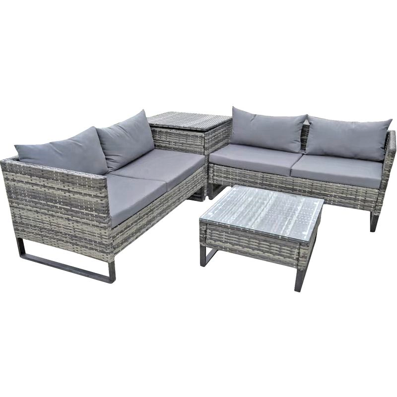 Sie besteht aus robustem Stahl und ist mit einem strapazierfähigen Polyrattan-Kunststoffgeflecht in verschiedenen Grautönen umspannt.