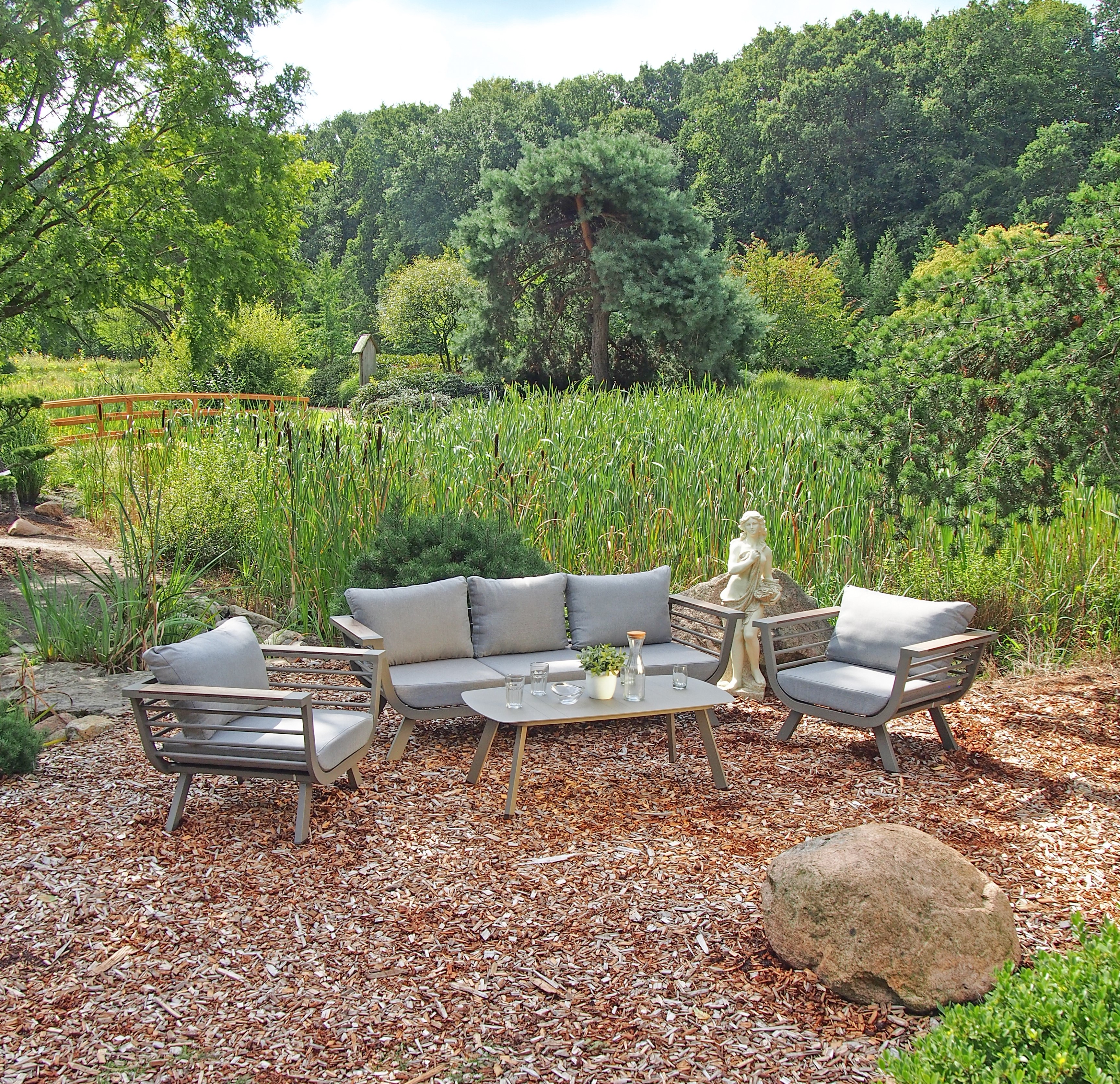 Die Möbel sind mit weichen Kissen und Auflagen in der Farbe Taupe ausgestattet, die nicht nur für zusätzlichen Komfort sorgen, sondern auch einen ansprechenden Kontrast zu dem Aluminiumrahmen bilden. Die fünf Kissen und drei Auflagen sind aus hochwertigem Polyester gefertigt, das nicht nur bequem, sondern auch strapazierfähig und wetterbeständig ist.