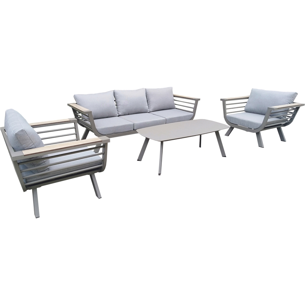 Die Lounge-Gruppe AROA ist die perfekte Wahl für alle, die ihre Terrasse oder ihren Garten in eine stilvolle und bequeme Oase verwandeln möchten. Die Gruppe besteht aus einem geräumigen 3-Sitzer Sofa, zwei gemütlichen Sesseln und einem eleganten Tisch, alle gefertigt aus robustem und langlebigem hellgrauem Aluminium.