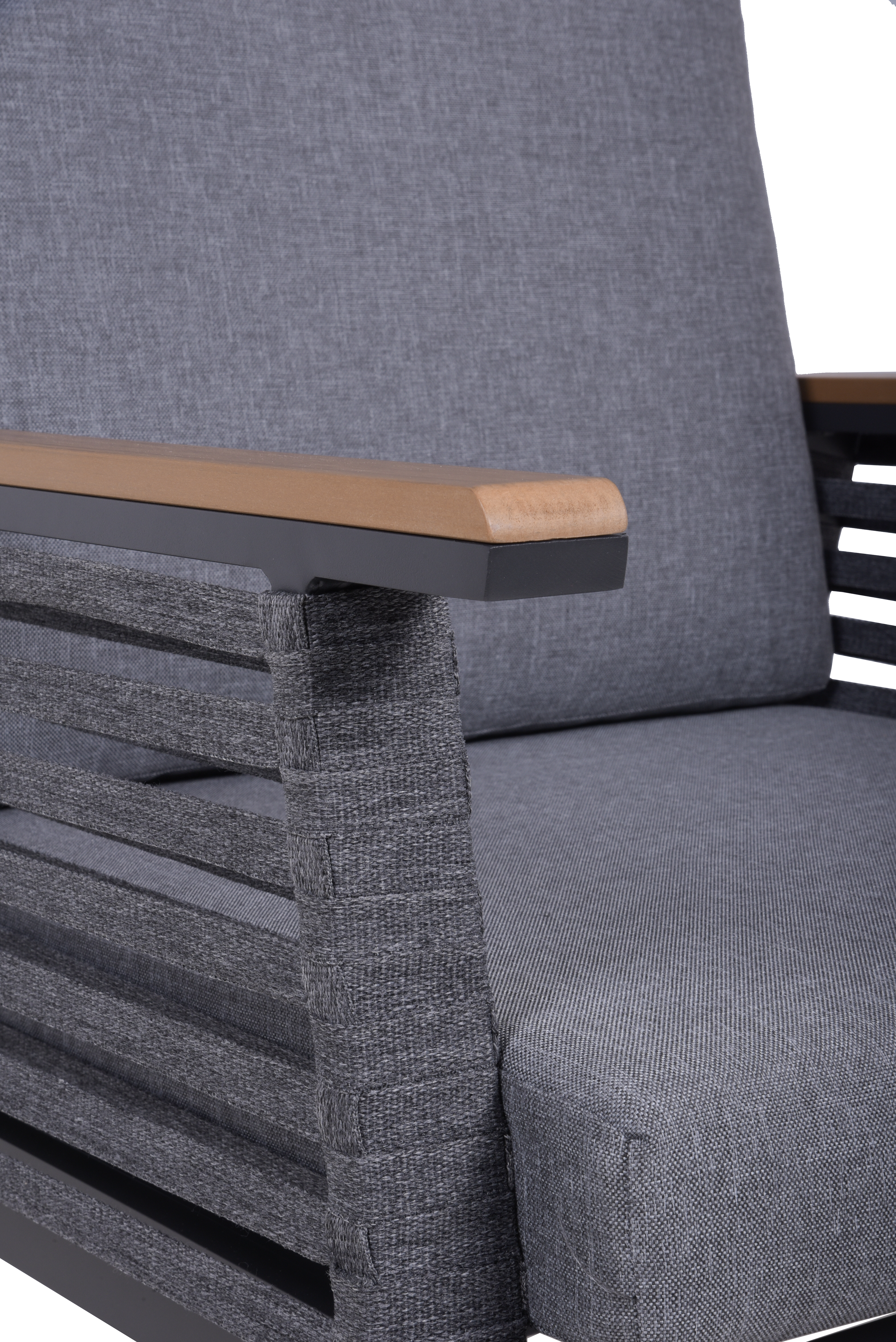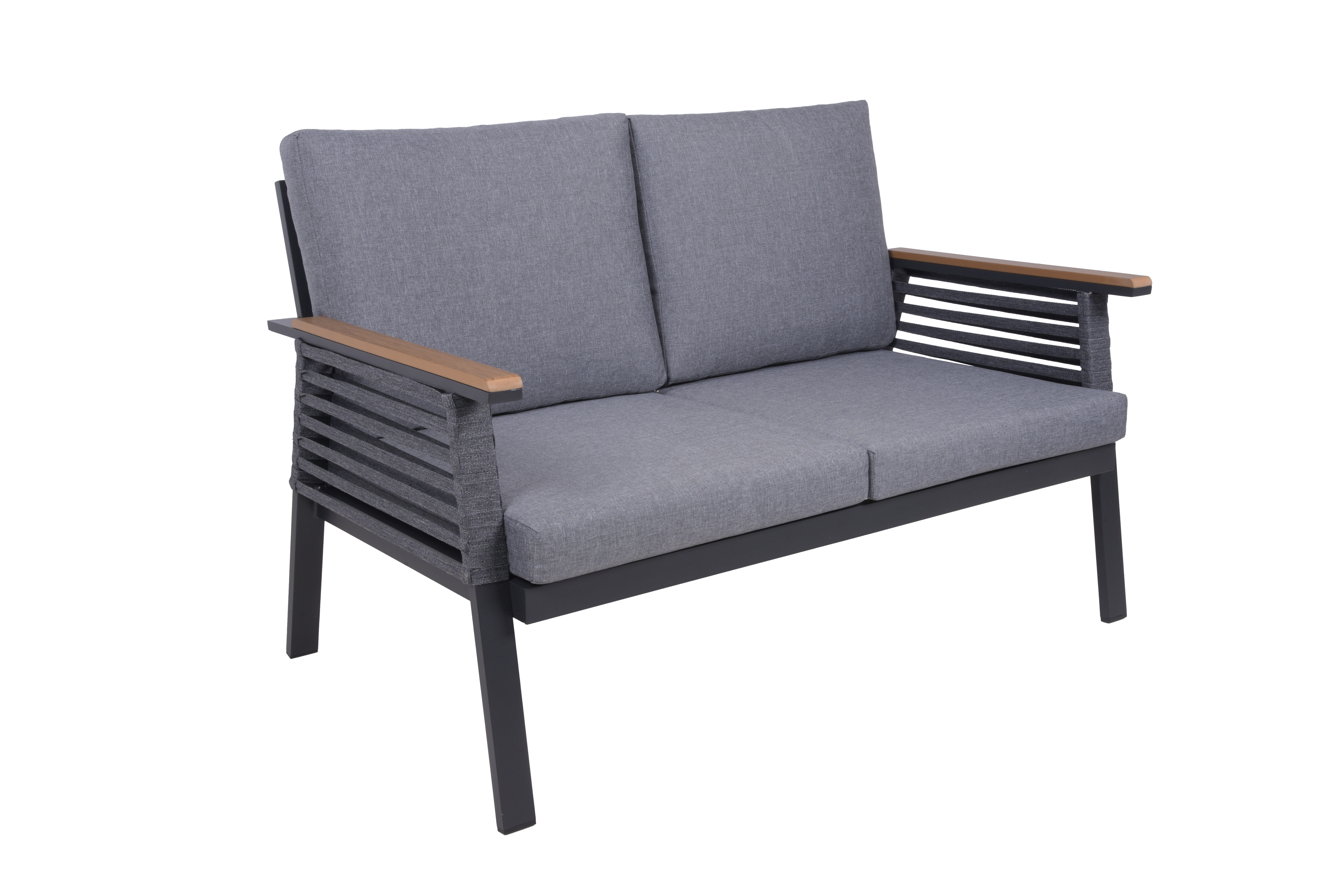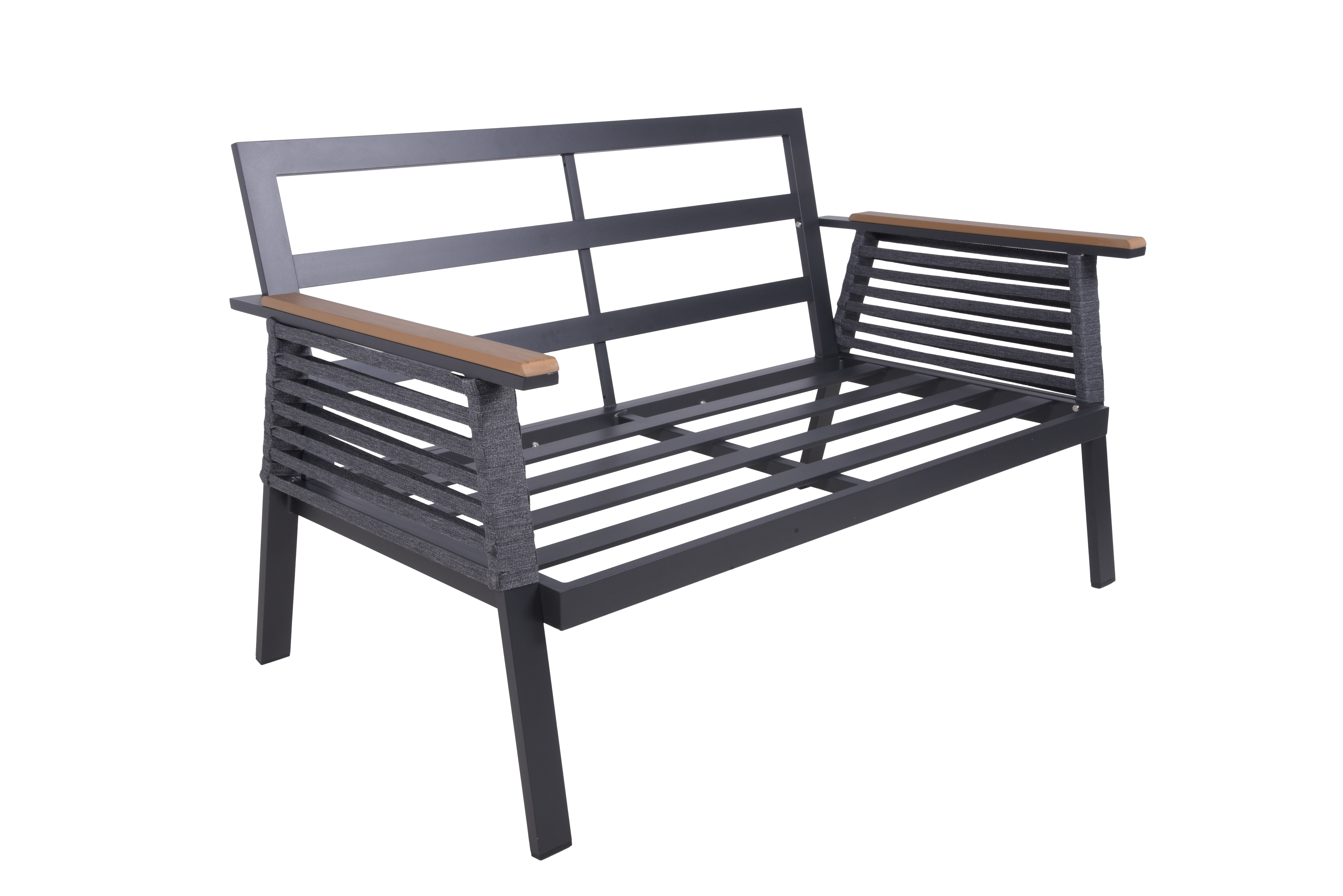 Hergestellt aus hochwertigem, pulverbeschichtetem Dunkelgrau Aluminium, Non-Wood und Seilbespannung, bietet sie nicht nur eine moderne Ästhetik, sondern auch Haltbarkeit gegenüber den Elementen.