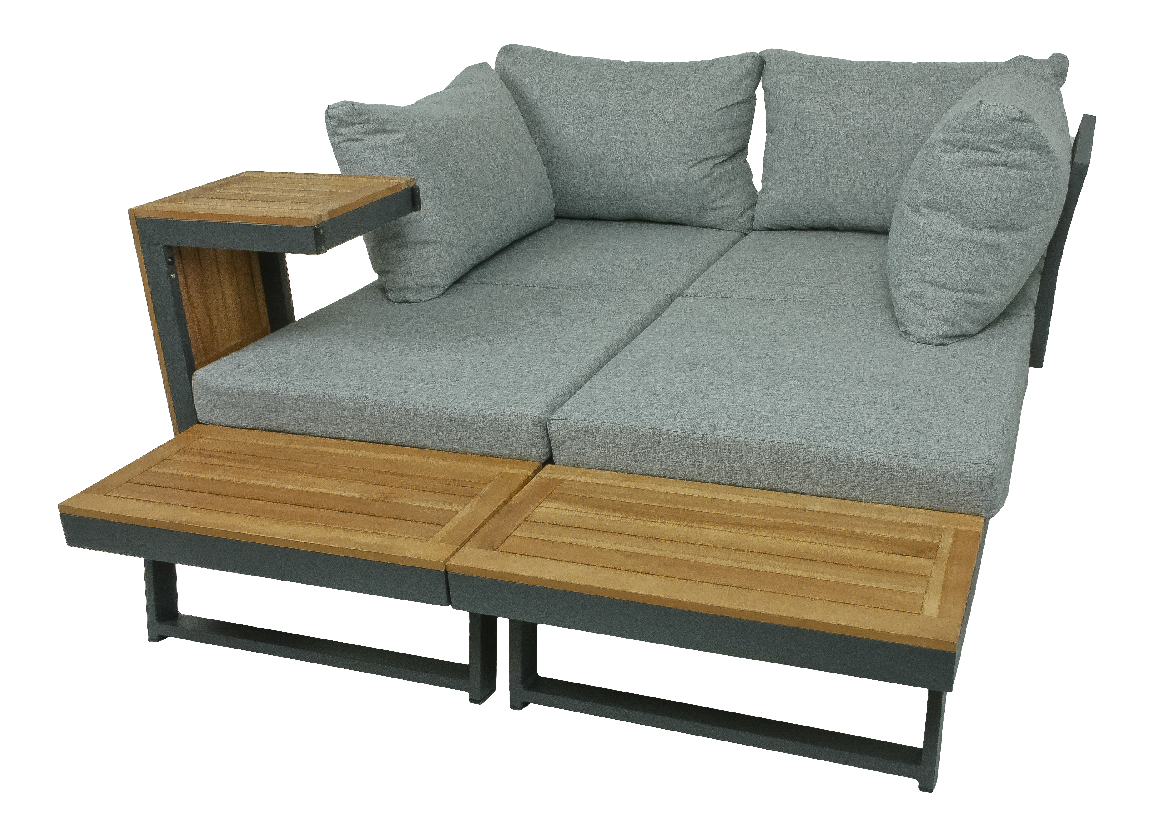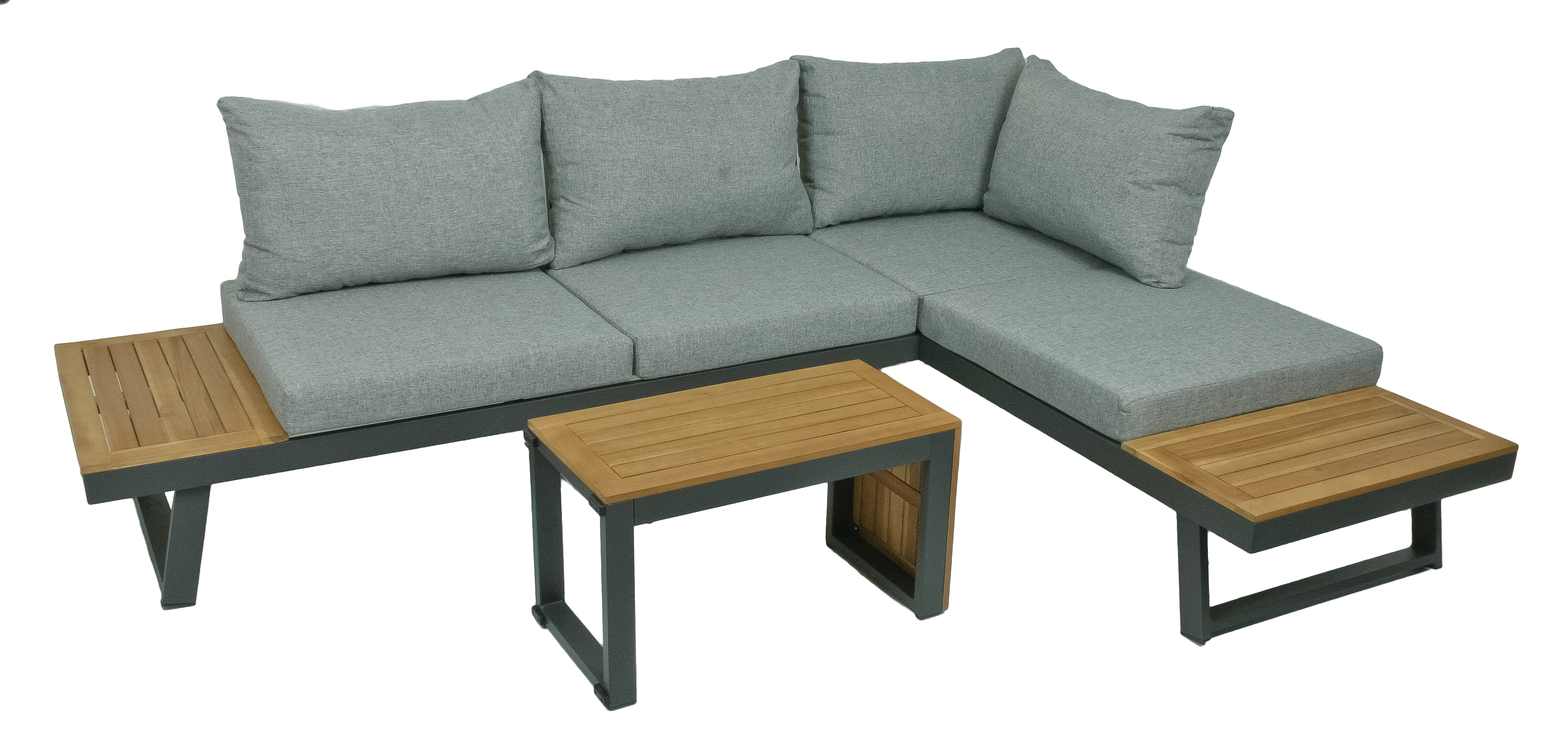 Das schwarze Aluminiumgestell verleiht der Lounge-Gruppe eine moderne und stilvolle Ausstrahlung und ist gleichzeitig langlebig und robust. Die bequemen Sofas sind mit weichen Kissen in der Farbe grau ausgestattet, die für zusätzlichen Komfort sorgen.