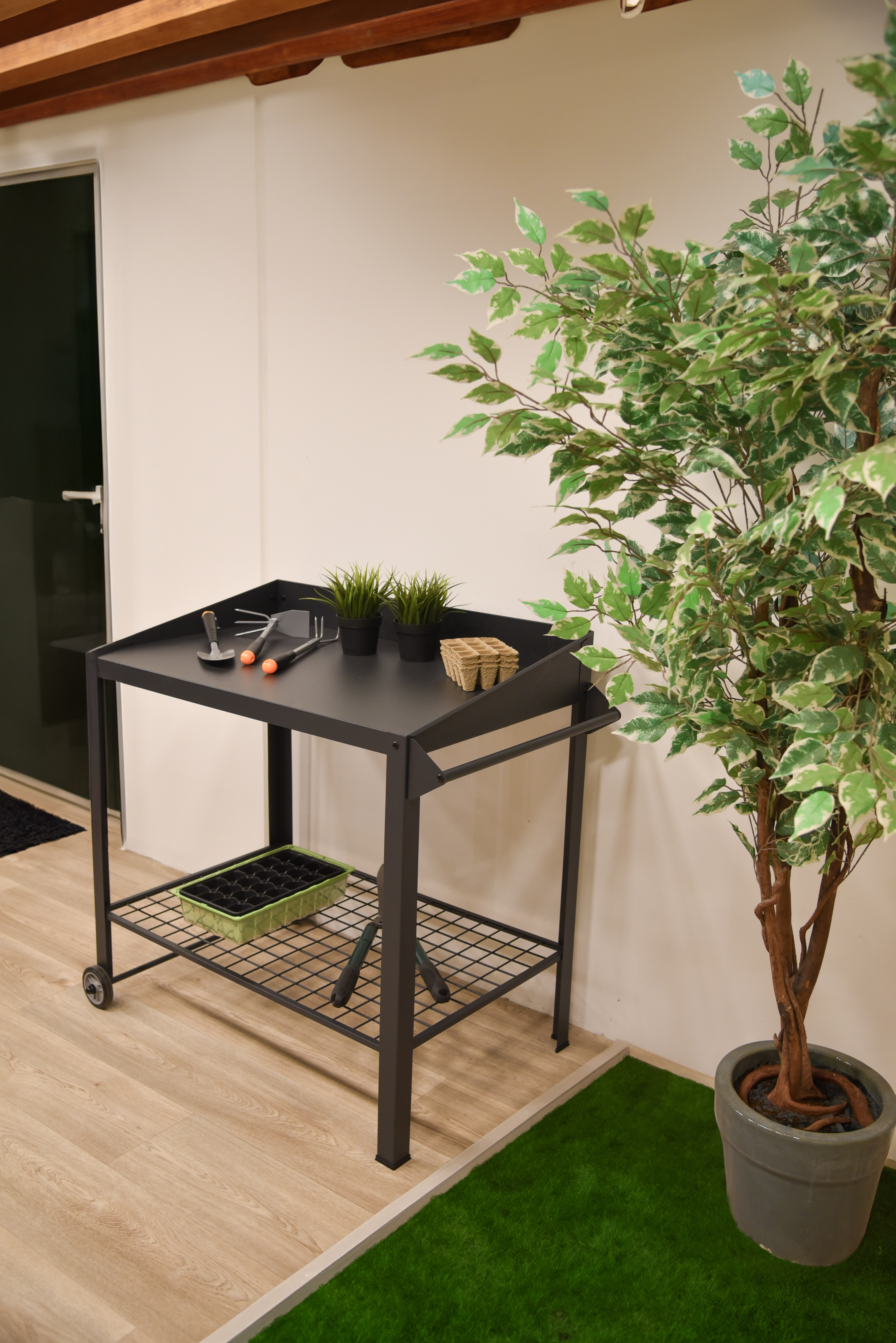 Der mobile Pflanztisch DIANA ist eine praktische Lösung für Gartenliebhaber, hergestellt aus anthrazit verzinktem Stahl mit einer hochwertigen Pulverbeschichtung.