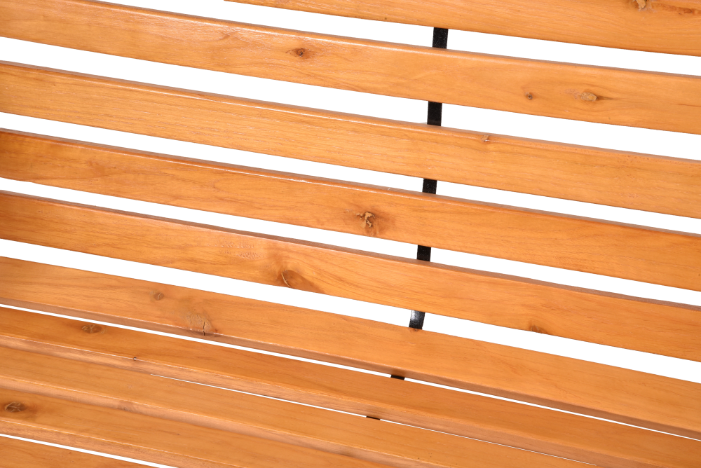 Die Sitzfläche aus chinesischer Spießtanne ist nicht nur umweltfreundlich, sondern auch äußerst langlebig und witterungsbeständig. Diese Bank ist daher ideal für den Einsatz im Freien geeignet.