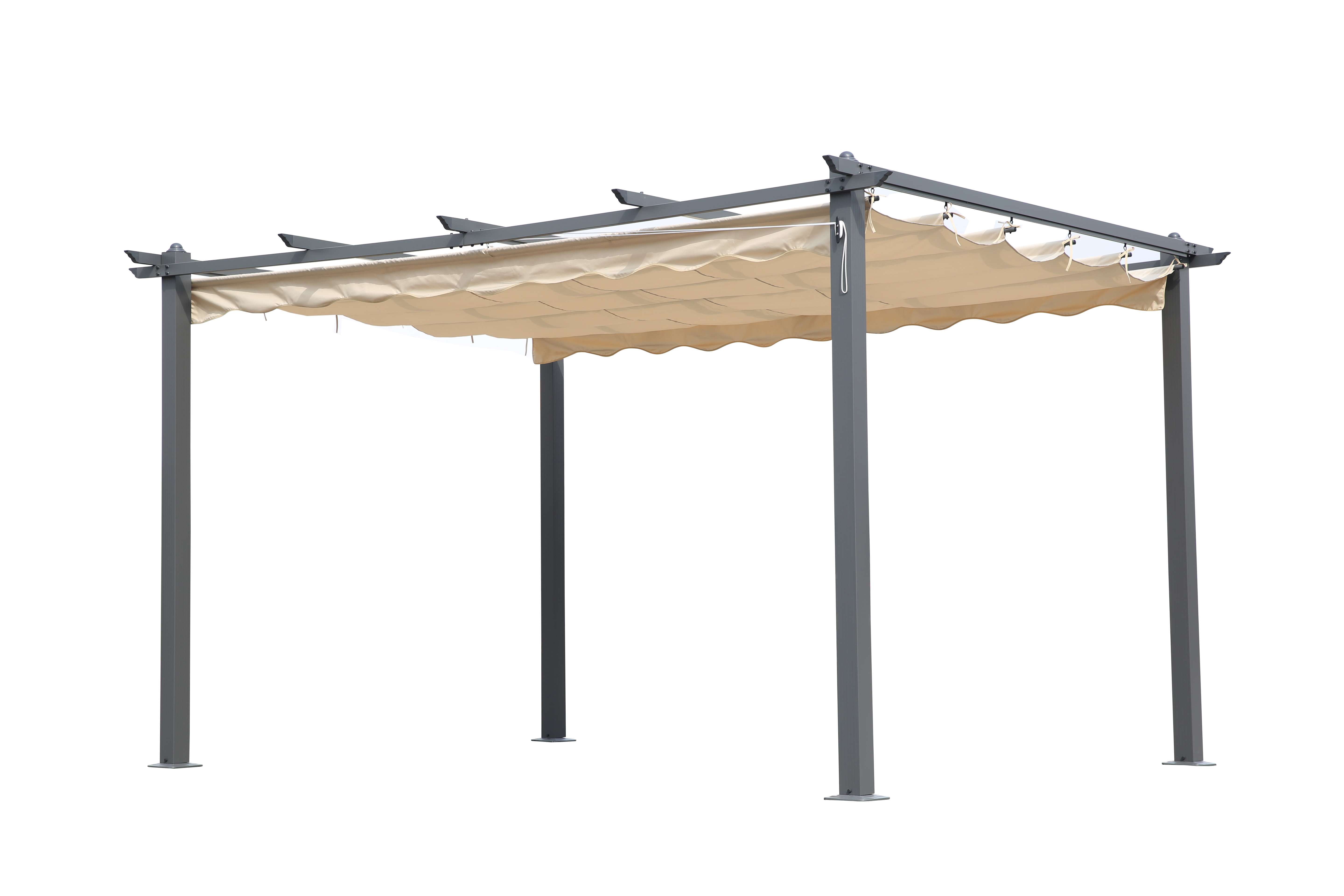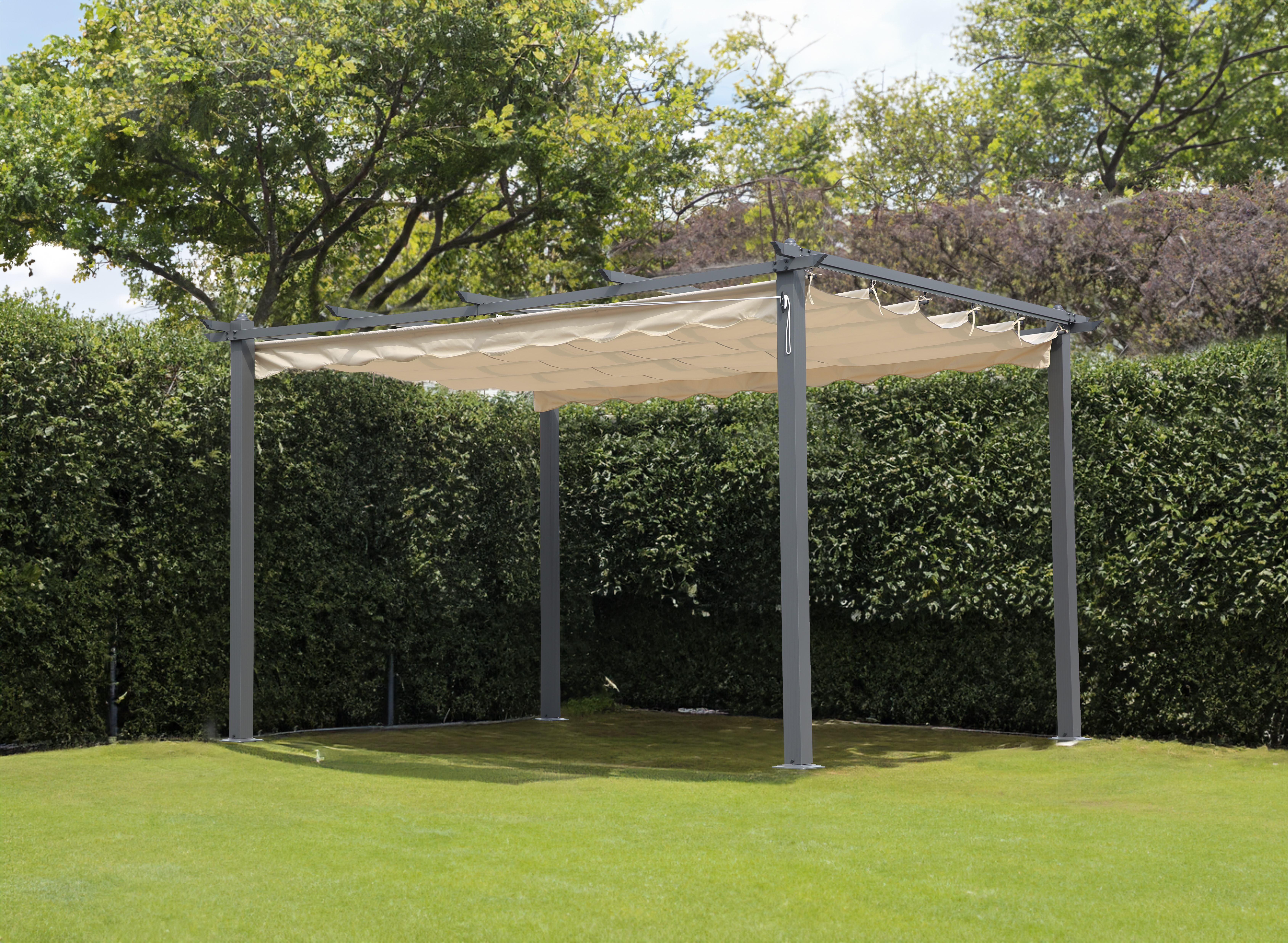 Das besondere Highlight des Pavillons ist das cremefarbige Faltdach aus Polyester, dass auf Laufschienen aus Aluminium montiert ist.