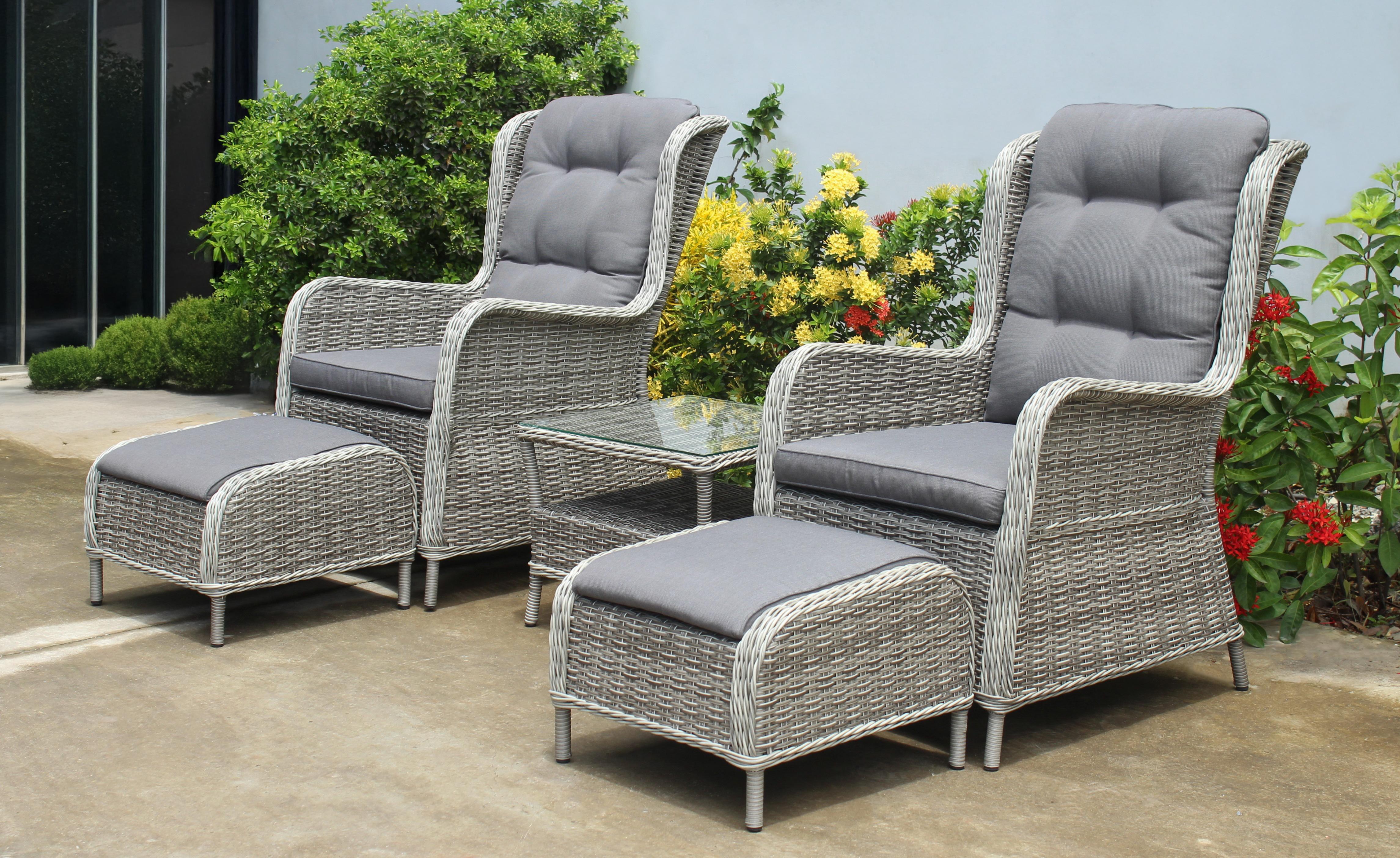 Das Sessel-Set VALENCIA ist eine moderne und bequeme Ergänzung für Ihre Außenbereich. Das Set besteht aus 2 Sesseln, 2 Fußhockern und einem Beistelltisch mit einer klaren Glasplatte, die eine stabile Grundlage für darauf abzustellende Gegenstände, wie beispielsweise Getränke, darstellt. Die gepolsterten Sitzflächen der Sessel und Fußhocker bieten einen hohen Komfort und durch die Rückenkissen aus Polyester in Dunkelgrau sind Sie auch beim Sitzen gut gestützt.