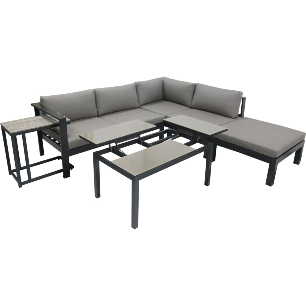 Das Sessel-Set VALENCIA ist eine moderne und bequeme Ergänzung für Ihre Außenbereich. Das Set besteht aus 2 Sesseln, 2 Fußhockern und einem Beistelltisch mit einer klaren Glasplatte, die eine stabile Grundlage für darauf abzustellende Gegenstände, wie beispielsweise Getränke, darstellt. Die gepolsterten Sitzflächen der Sessel und Fußhocker bieten einen hohen Komfort und durch die Rückenkissen aus Polyester in Dunkelgrau sind Sie auch beim Sitzen gut gestützt.