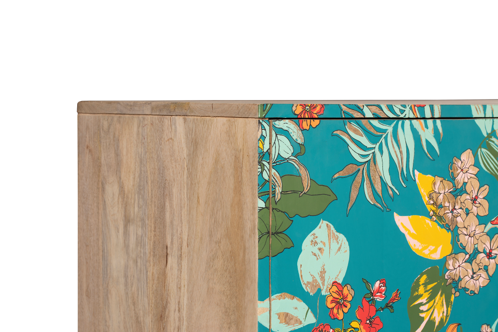 Unser Sideboard REIPUR (Materialmix Mango massiv & MDF, lackiert) mit seiner ausdrucksstarken Optik (Aufdruck mit bunter Pflanzenoptik) beeindruckt durch sein individuelles Design und vereint Form und Funktion.